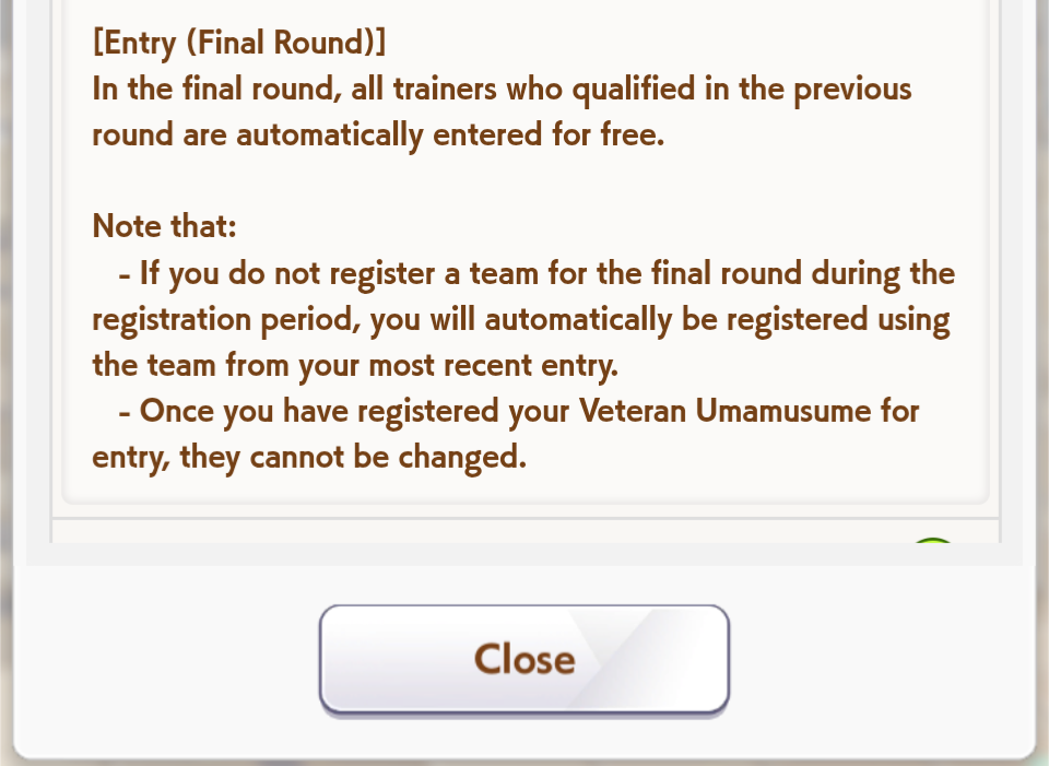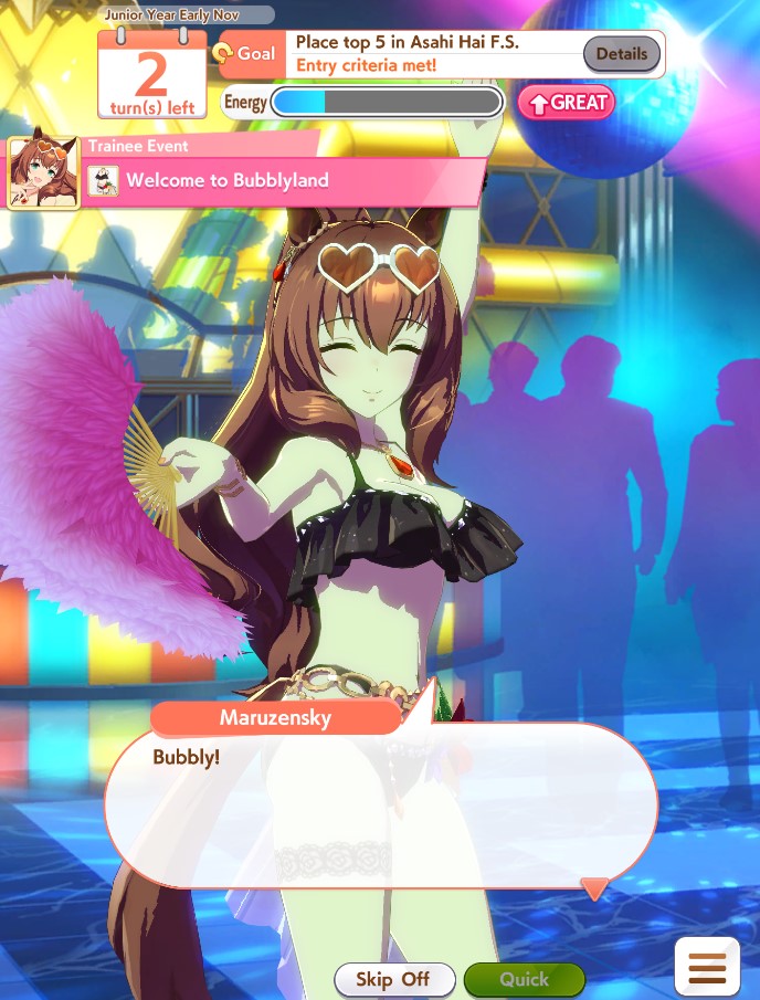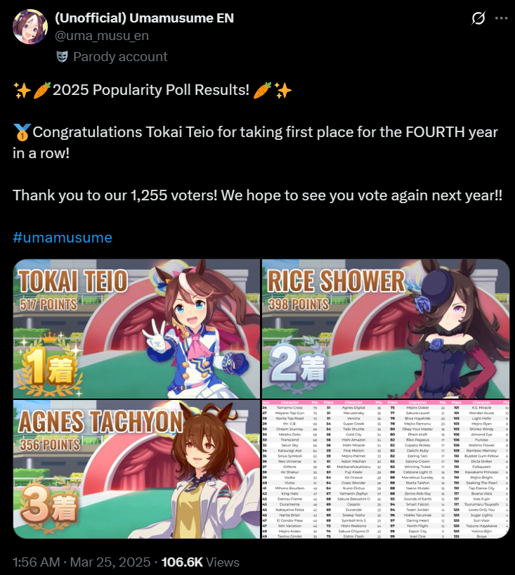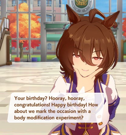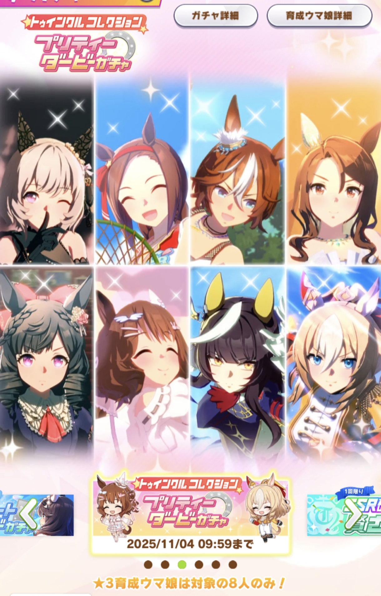 Previous: >>>>542681060>JP Game NewsCurrent Rate Up: Hishi Akebono (Alt 3*), Marvelous Sunday (Alt 3*), Fuji Kiseki (SSR), Eishin Flash (SSR)10/7 - Legend Race vs NTR and Super Creek (Alt)Early October - Tachyon's Factor ResearchLate October - New training scenarioOctober: CM Sprint - Niigata 1200mNovember: LoH Dirt - Morioka 1600mDecember: CM Mile (No debuffs) - Hanshin 1600m>Global Game NewsCurrent Rate Up: Summer Maruzensky (Alt 3*), Summer Special Week (Alt 3*), Sweep Tosho (SSR), Winning Ticket (SSR)10/7 - CANCER CUP - Tokyo 1600m10/14 - Summer Story event10/21 - Meisho Doto (3*), Special Week (SSR), Tokai Teio (SSR)10/26 - Half Anniversary Part 110/30 - Eishin Flash (3*), Nice Nature (SSR), Tosen Jordan (SR)10/30 - LEO CUP - Hanshin 2200mTimeline: https://uma.moe/timeline>IP NewsUmamusume Cinderella Gray 2nd cour will air on 10/5Umamusume 6th Live Event Autumn Leg will be held on 10/18-19Guest Starring:Alexandros, Ooishi Masayoshi (Day 1), Kageyama Hironobu (Day 2)https://umamusume.jp/contents/event/tnf6th-autumn/>Thread CirclesJP: ウマオオオオ (20 million/month), PUMA, ウマぴょいのまにまに (No quota)EN: https://rentry.org/globalclubsumaYou must be E3 (20k points) to join a circle. Apply with /uma/ or /vg/ in your profile or post ID in the thread.>All Guides & Resourceshttps://rentry.org/uma26Game databasehttps://gametora.com/umamusume (Click the gear to switch between JP / global server info)A basic guide for newfagshttps://rentry.org/umaglobalFind networks if your region is blocked from the game or clienthttps://www.umavpn.top/93Seiyuu & Concertshttps://rentry.org/umst/uma/ POG (Paper Owners Game)https://rentry.org/umapog