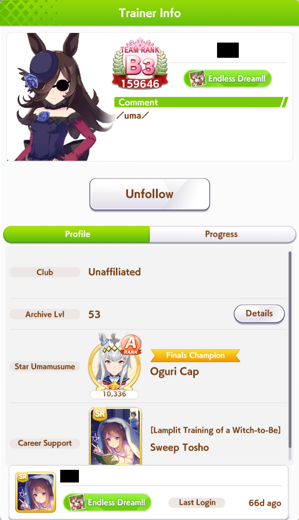 >>542706438Anyone else wants to join? Rules are the following>5 days of inactive login or 5 days flatline >6 million monthly quota >Just do your best whenever you are available>No discord>No drama>Dont forget to trade shoes or else>Lets avoid burnout and enjoy the gamePut your ID here or put /uma/ in your profile when applying ingame