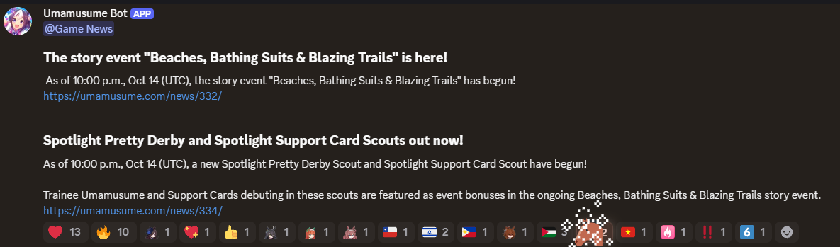 Previous: >>>>542681060>JP Game NewsCurrent Rate Up: Hishi Akebono (Alt 3*), Marvelous Sunday (Alt 3*), Fuji Kiseki (SSR), Eishin Flash (SSR)10/7 - Legend Race vs NTR and Super Creek (Alt)Early October - Tachyon's Factor ResearchLate October - New training scenarioOctober: CM Sprint - Niigata 1200mNovember: LoH Dirt - Morioka 1600mDecember: CM Mile (No debuffs) - Hanshin 1600m>Global Game NewsCurrent Rate Up: Summer Maruzensky (Alt 3*), Summer Special Week (Alt 3*), Sweep Tosho (SSR), Winning Ticket (SSR)10/7 - CANCER CUP - Tokyo 1600m10/14 - Summer Story event10/21 - Meisho Doto (3*), Special Week (SSR), Tokai Teio (SSR)10/26 - Half Anniversary Part 110/30 - Eishin Flash (3*), Nice Nature (SSR), Tosen Jordan (SR)10/30 - LEO CUP - Hanshin 2200mTimeline: https://uma.moe/timeline>IP NewsUmamusume Cinderella Gray 2nd cour will air on 10/5Umamusume 6th Live Event Autumn Leg will be held on 10/18-19Guest Starring:Alexandros, Ooishi Masayoshi (Day 1), Kageyama Hironobu (Day 2)https://umamusume.jp/contents/event/tnf6th-autumn/>Thread CirclesJP: ウマオオオオ (20 million/month), PUMA, ウマぴょいのまにまに (No quota)EN: https://rentry.org/globalclubsumaYou must be E3 (20k points) to join a circle. Apply with /uma/ or /vg/ in your profile or post ID in the thread.>All Guides & Resourceshttps://rentry.org/uma26Game databasehttps://gametora.com/umamusume (Click the gear to switch between JP / global server info)A basic guide for newfagshttps://rentry.org/umaglobalFind networks if your region is blocked from the game or clienthttps://www.umavpn.top/93Seiyuu & Concertshttps://rentry.org/umst/uma/ POG (Paper Owners Game)https://rentry.org/umapog