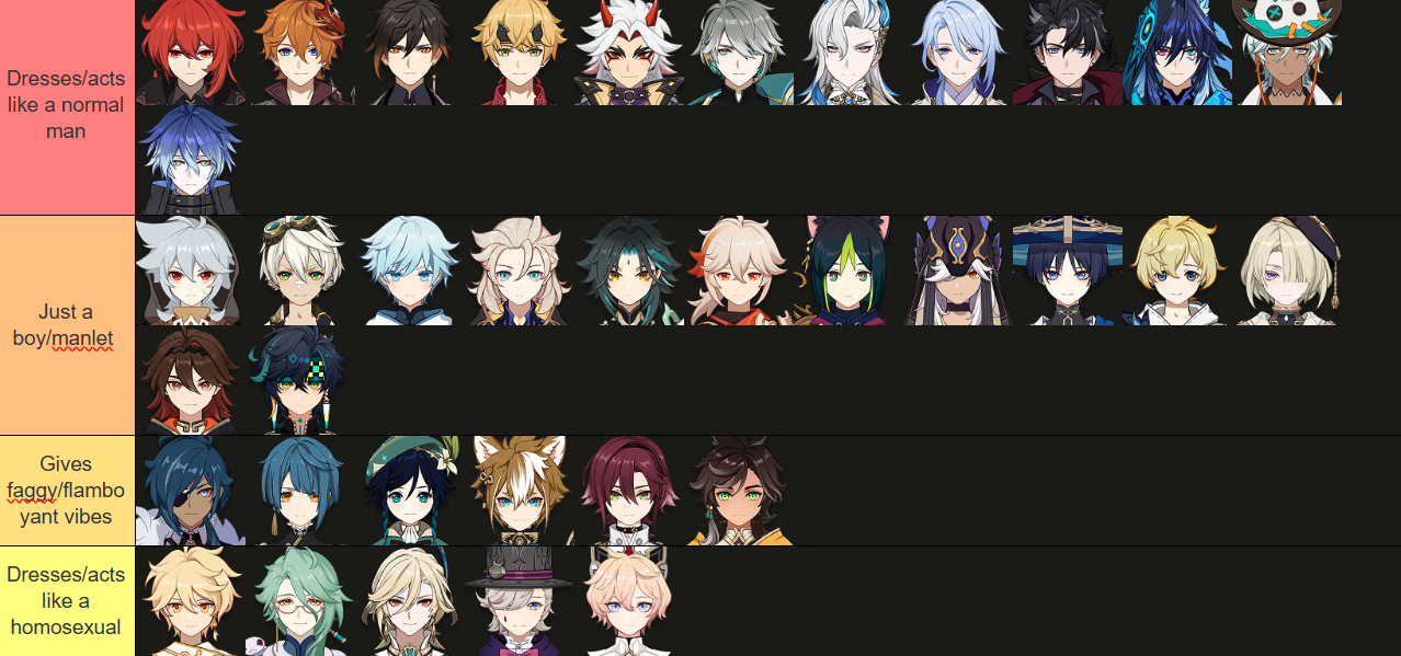 [ULTIMATE WORM DRESS TIER LIST]I judge these worms by the way they act and their clothing and how much of a faggy vibe they give off.COCLUSION: Genshin is NOT a gay game, while its worms might be gayer than FGO ones, they are not really homosexual as /gig/ keeps claiming them to be