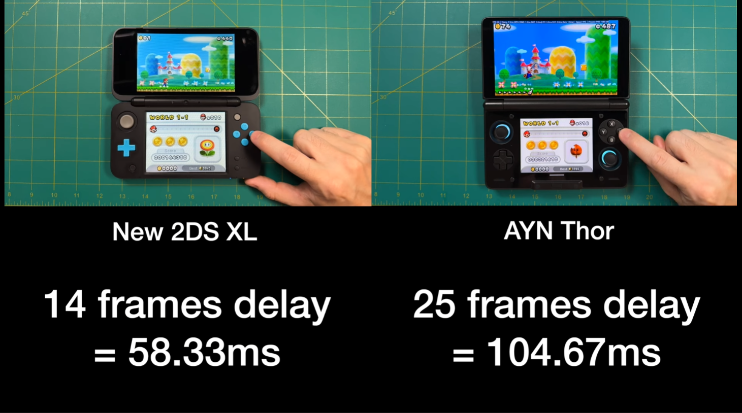 >>542830665The actual shocking part about this image is that the 2DS has FOURTEEN frames of delay when running a DS game?? Real?? I expected more like two..