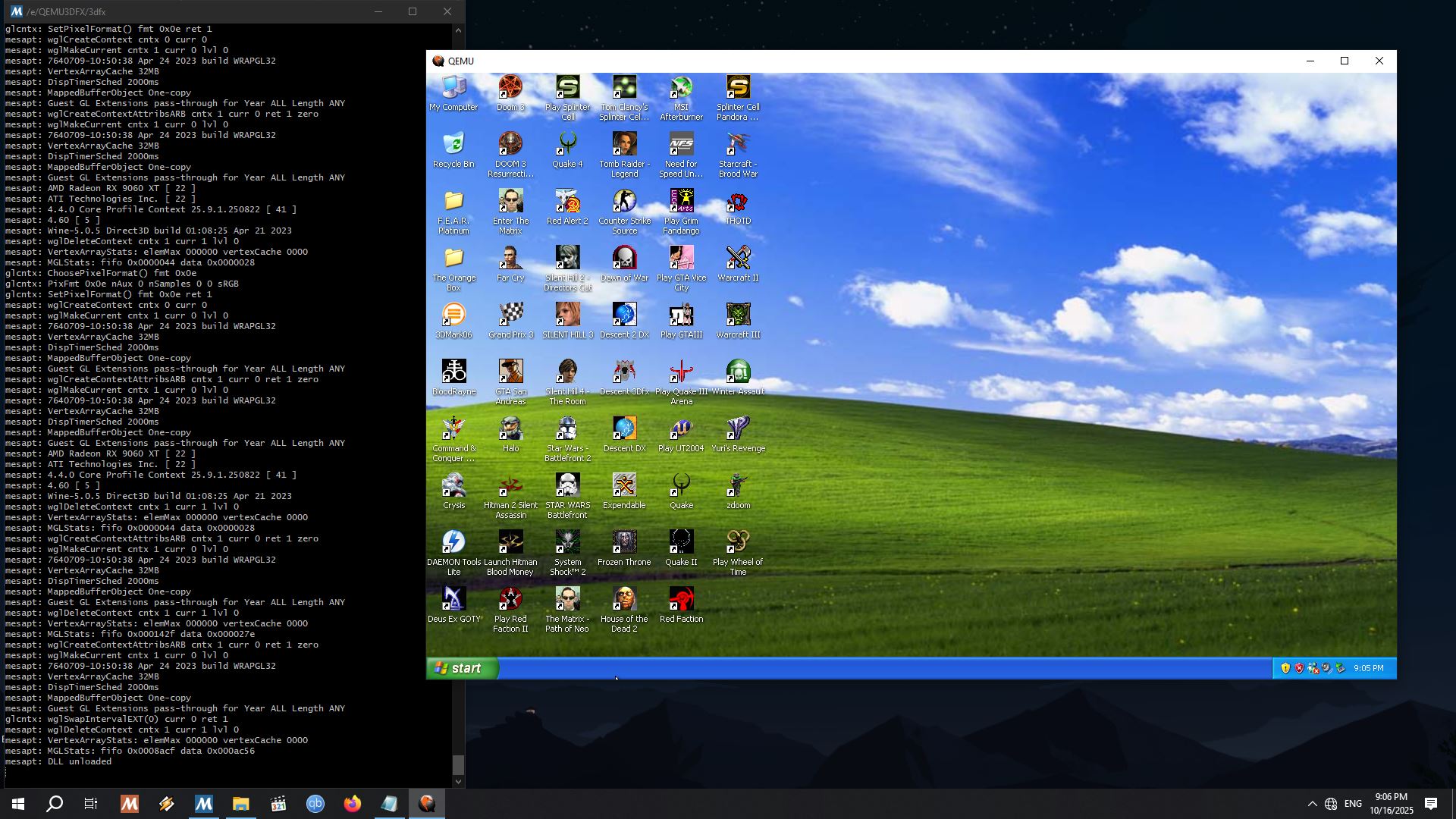 why run qemu when you can use wsl2 to make an ubuntu conteiner and run qemu with virt-manager and create a windows xp machine? qemu on linux has perfect gpu passthru because of kvm