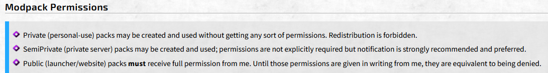 >>542859406>you're not allowed to use his shit in public packs without his explicit permissionEven if someone cares about mod permission nonsense for whatever reason, nothing stops them from adding "install ChromatiCraft mod manually or else it breaks" in the modpack description. Reika can't claim that you're using his assets because you aren't.I'm glad it generally isn't the case with Minecraft modders. If it was a Bethesda-tier shitshow, /mmcg/ would be smuggling mods and packs like narcotics.