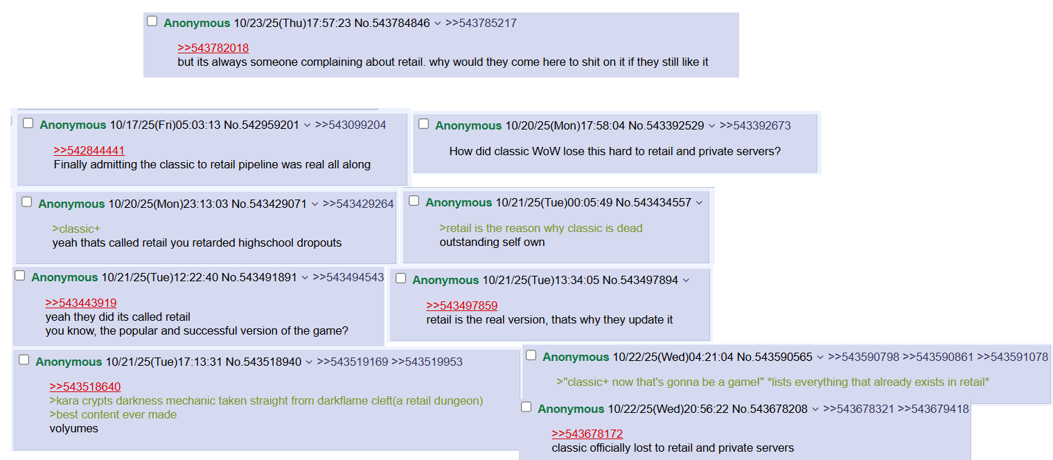 >>543783979I'd wager a majority of people bringing up retail ITT have played or do play retail making them retail players alsothis thread will finally be free of talking about retail once every person who has ever installed that game leaves this place and the only people who remain are true sovlfvl classic enjoyers