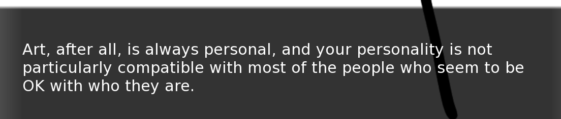 >>542853352>>whose work is this actually, and who is it actually foryeah. i think about that kind of thing a lot too. like what's the point, what's the real purpose, is this even getting at anything. does it mean anything to anyone. does it even mean something to me? or was it always just fulfilling some emotional desire that starts to lose its taste after a decade, or something. maybe that's being too cynical, though. it does mean something to me. it's just hard to really get at that meaning or figure it out, or motivate myself to crack the hard shell that surrounds it with time and effort. i don't know. the VN you're making seems cool though. i think a lot of people appreciate it, maybe more than you know. i think that's easy to forget. as stupid as it may seem to you, or insignificant, or even like people dont care that much, maybe they do, or at least one person. you don't know.