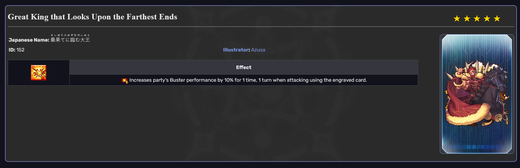 If you wanted to patternfag the last two grand duels, there's not been any two from the same mythosphere. Azrael and Noah are both Abrahamic, but Azrael came out even after the New Testament as far as I can tell while Noah is from the Old, of course.With this in mind Solomon wouldn't appear for the duels and would probably be saved for the finale. I think I'd be odd for there not to be any Arthurian reps, but I can't think of any especially great archers or spellcasters on that front whom we don't already have.