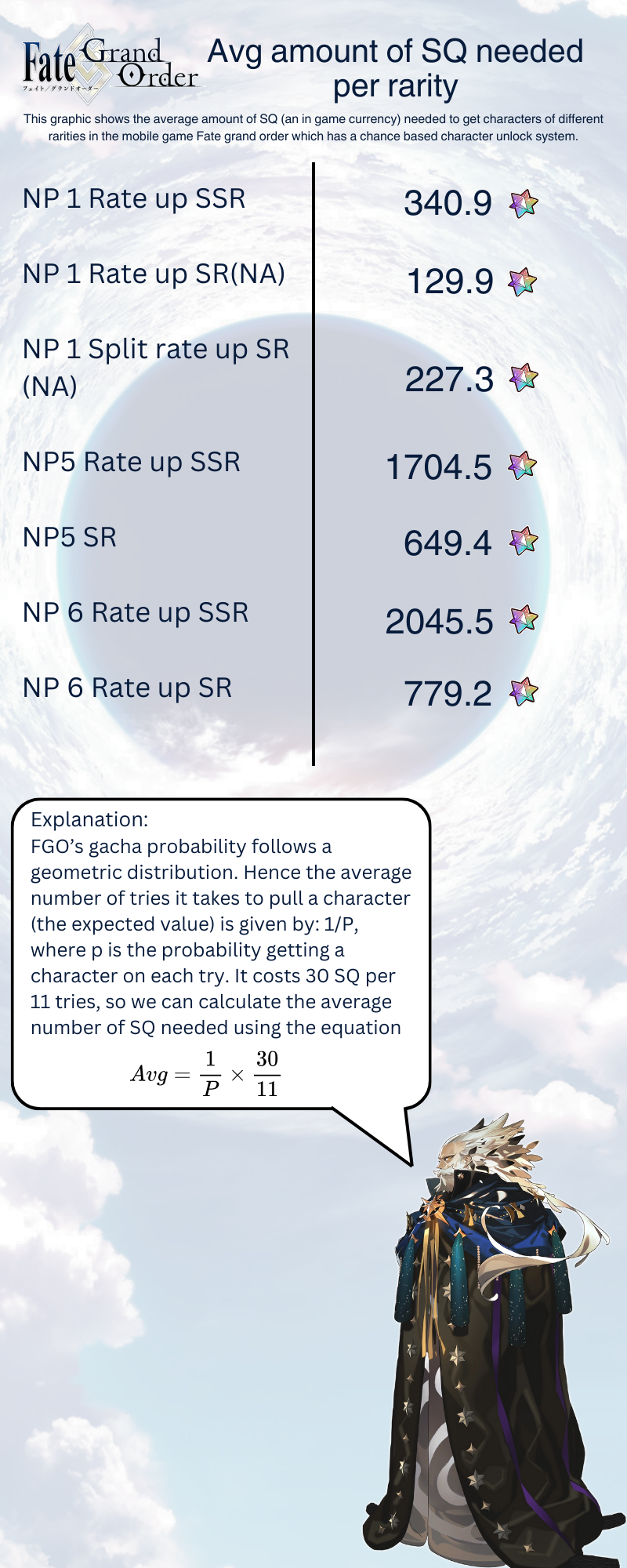 >>542946835The game gives out roughly ~2000 SQ per year from events, daily logins, new story, and promotional campaigns combined. If you're a new player you'll probably have ~1000+ SQ (i actually have no clue on this true value, i just know it's a lot) from story and interludes and rankups and other campaigns you can catch up on.Pity is at 900 SQ for an SSR. There is no 4* pity. Pic related for average rates (they recently upped 4* rates a bit, so it's a bit out of date.)