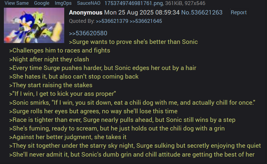 Welcome to the Sonic General! Here we discuss all things Sonic!/sthg/ #8734 - Fox's Embrace Edition==NEWS==>Sonic Racing: CrossWorlds - Accolades Trailerhttps://youtu.be/C6BSu_x0gcE >SAGExpo 2025https://www.sagexpo.org/>Mobile card game Sonic Blitzhttps://rentry.org/sthglinks#sonic-blitz-apk>Sonic Rumble Global Launch Delayedhttps://sonicrumble.com/GLDelay>Sonic the Hedgehog 4 to release on March 19, 2027https://variety.com/2025/film/news/sonic-4-release-date-march-2027-1236280697/==Comic Release Dates==Sonic the Hedgehog: Chaotix's 30th Anniversary - 22 October 2025Sonic the Hedgehog #82 - 19 November 2025Sonic the Hedgehog #83 - 17 DecemberSonic the Hedgehog #84 - 14 January 2026Sonic Racing: CrossWorlds (oneshot) - 28 January 2026Sonic the Hedgehog: Chasing Shadows - 4 March 2026==GENERAL INTEREST LINKS==https://rentry.org/sthglinks>/sthg/ OP template:https://rentry.org/sthgtemplate>Milestone pastebin:https://pastebin.com/LJCfZhY4>Sonic Game/Mod Recommendation Spreadsheet:https://rentry.org/sthglinks#sonic-gamemod-recommendation-spreadsheet>Perfect System Collection:https://rentry.org/sthglinks#perfect-system-collection>Sonic comic scans:https://grabber.zonehttps://tails.kicks-ass.net/>#10000 Projecthttps://pastebin.com/Fb8Bt4ru>/sthg/ booru:https://sthg.booru.org/>/sthg/ OCs:https://sthgoc.tumblr.com/archive/>/sthg/ CyTube:https://cytube/r/sthg>/sthg/ Pixels:https://ourworldofpixels.com/sthgPrevious Zone:>>542825601