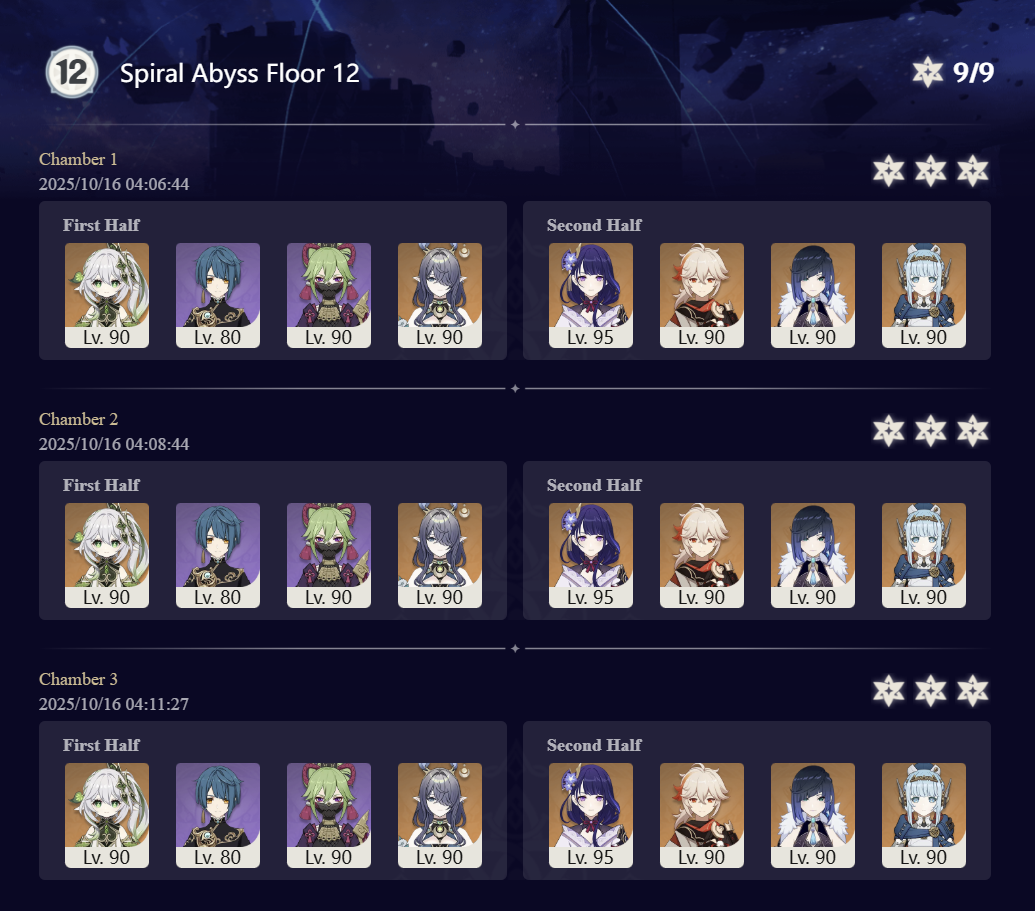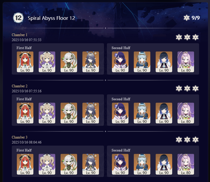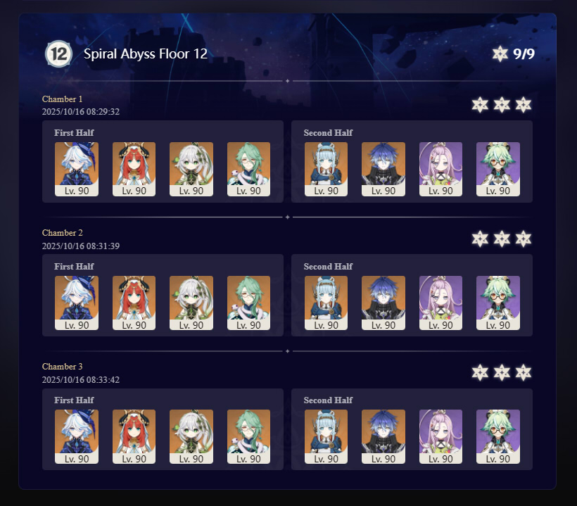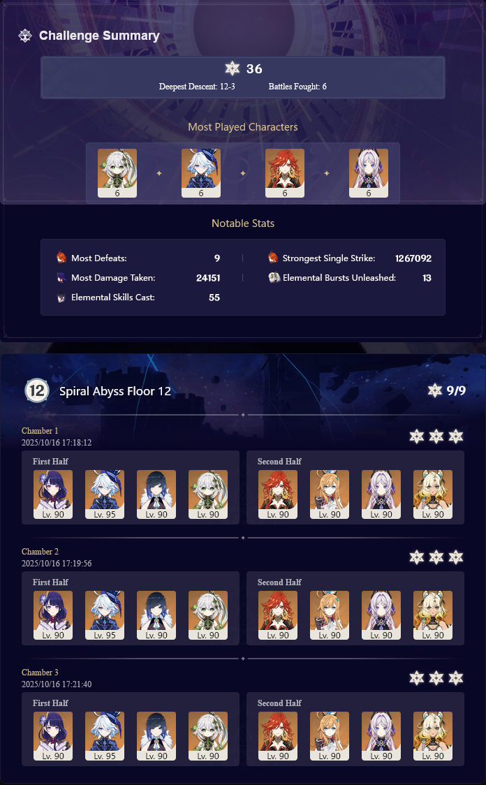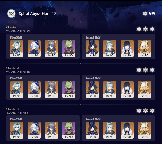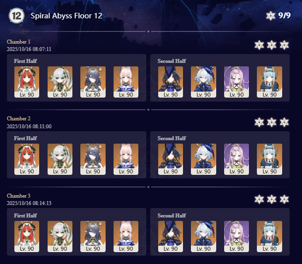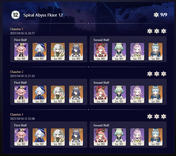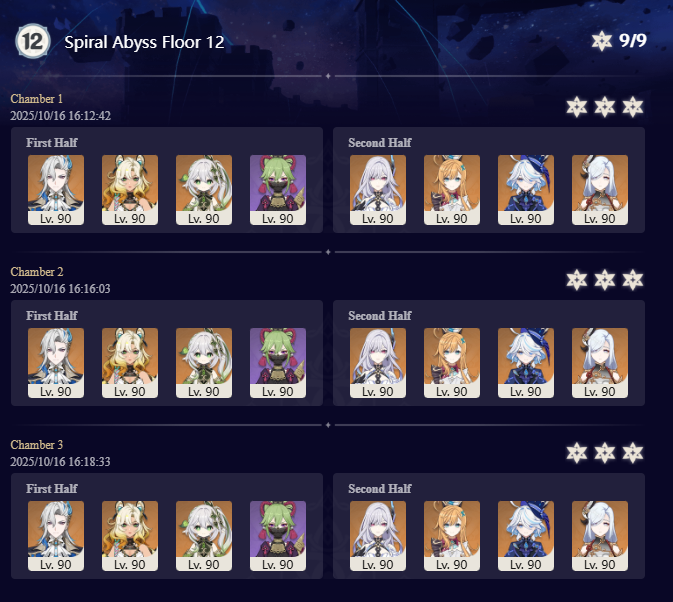 Luna I 2025-09-16 Spiral Abyss StatisticsSample size: 166 (4/gig/ and 8/gig/)Finalized: 2025-10-16Character Usage:https://files.catbox.moe/ppjz0e.pngCharacter Usage (lite mode):https://files.catbox.moe/r40nqr.pngOther Statistics:https://files.catbox.moe/kdgco2.pngCongratulations to these anons for being"4/gig/'s Top 10 SOVLFVL clears of Spiral Abyss 2025-09-16 Luna I"#1. Sample #50 - >>539336807 - 957 points#2. Sample #102 - >>539372921 - 946 points#3. Sample #25 - >>539315921 - 923 points#4. Sample #150 - >>539593386 - 921 points#5. Sample #24 - >>539313494 - 919 points (earlier submission)#6. Sample #43 - >>539325457 - 919 points#7. Sample #146 - >>539557234 - 919 points#8. Sample #156 - >>539698748 - 913 points#9. Sample #122 - >>539456737 - 903 points#10. Sample #5 - >>539301093 - 900 pointsLeaderboard: https://files.catbox.moe/ryff8q.pngHow the ranking is tabulated?Every submissions get 1000 points as default grade,then the grade will be reducted based on voting data of this poll (Vote if you haven't: https://strawpoll.com/B2ZB9wmqAgJ)Submissions with similar grade will then be ranked by the order of submission time (earlier submission gets high rank)Good luck on your next Spiral Abyss, anons!