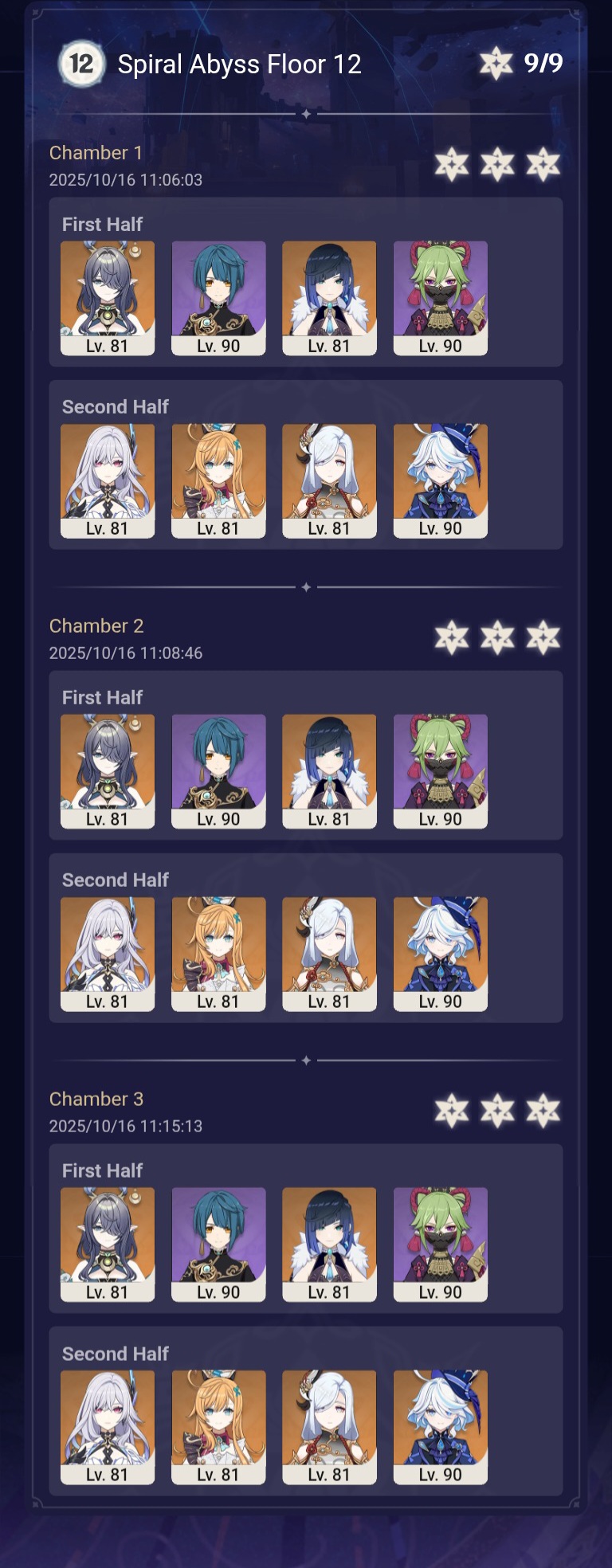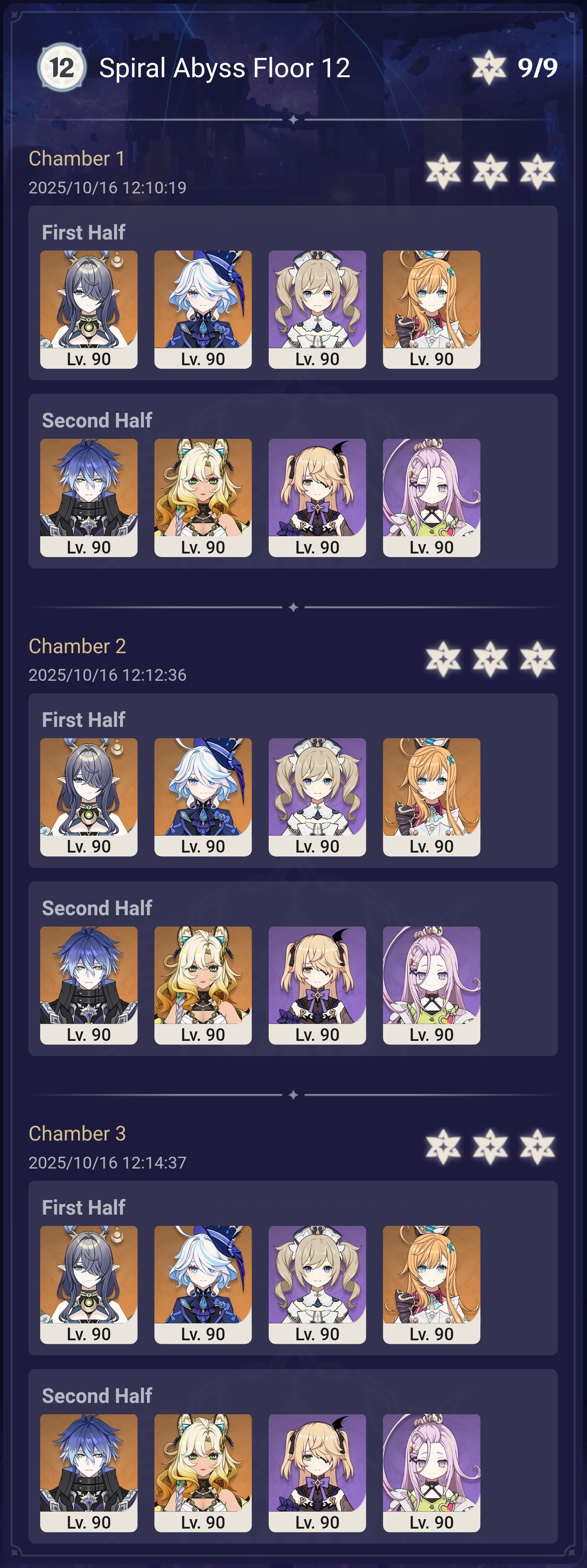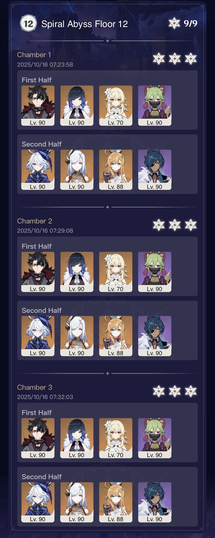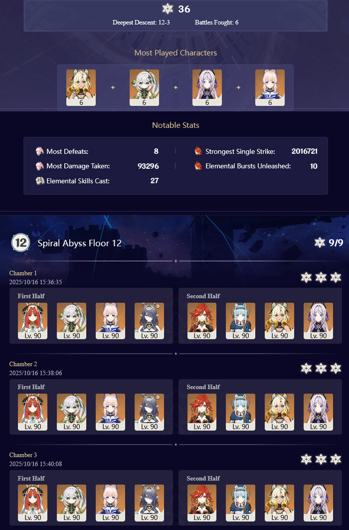Luna I 2025-09-16 Spiral Abyss StatisticsSample size: 166 (4/gig/ and 8/gig/)Finalized: 2025-10-16Character Usage:https://files.catbox.moe/ppjz0e.pngCharacter Usage (lite mode):https://files.catbox.moe/r40nqr.pngOther Statistics:https://files.catbox.moe/kdgco2.pngCongratulations to these anons for being"4/gig/'s Top 10 SOVLFVL clears of Spiral Abyss 2025-09-16 Luna I"#1. Sample #50 - >>539336807 - 957 points#2. Sample #102 - >>539372921 - 946 points#3. Sample #25 - >>539315921 - 923 points#4. Sample #150 - >>539593386 - 921 points#5. Sample #24 - >>539313494 - 919 points (earlier submission)#6. Sample #43 - >>539325457 - 919 points#7. Sample #146 - >>539557234 - 919 points#8. Sample #156 - >>539698748 - 913 points#9. Sample #122 - >>539456737 - 903 points#10. Sample #5 - >>539301093 - 900 pointsLeaderboard: https://files.catbox.moe/ryff8q.pngHow the ranking is tabulated?Every submissions get 1000 points as default grade,then the grade will be reducted based on voting data of this poll (Vote if you haven't: https://strawpoll.com/B2ZB9wmqAgJ)Submissions with similar grade will then be ranked by the order of submission time (earlier submission gets high rank)Good luck on your next Spiral Abyss, anons!
