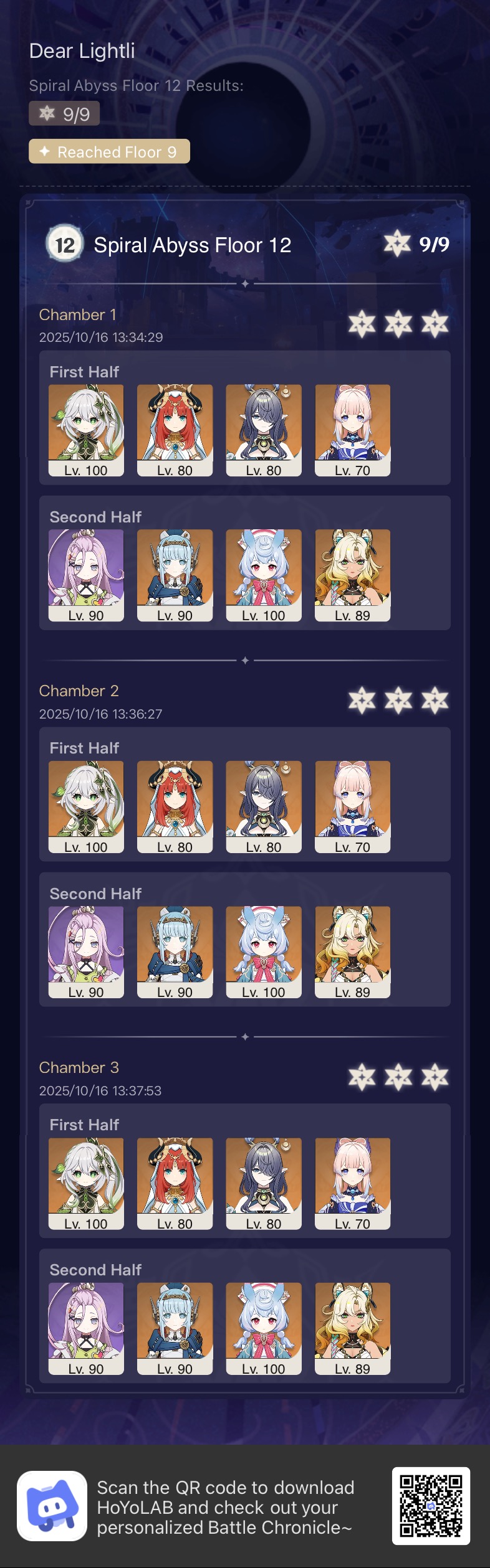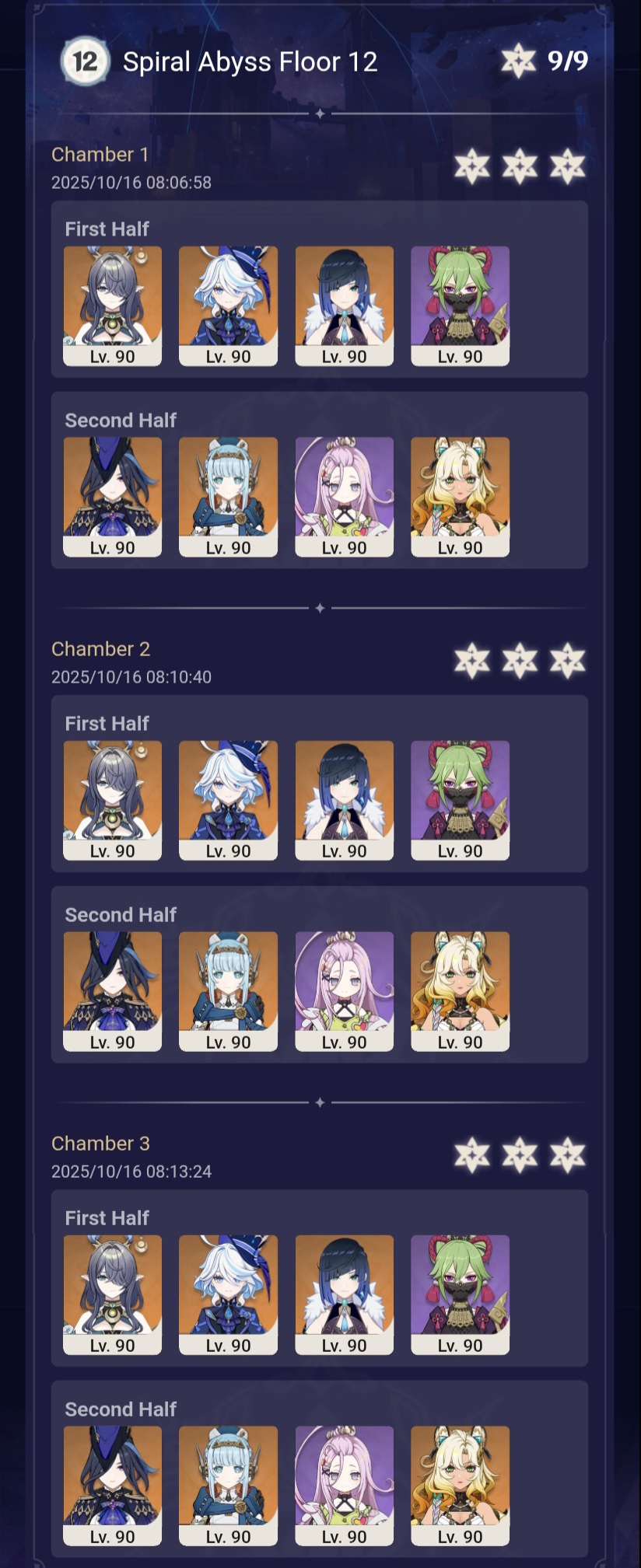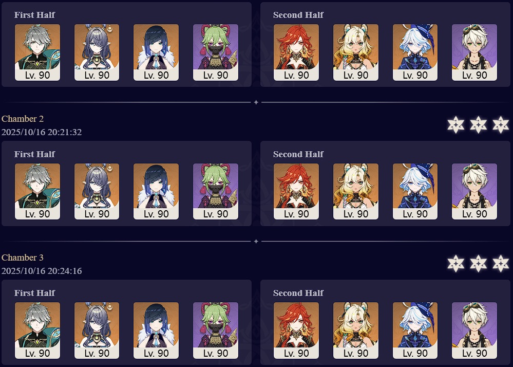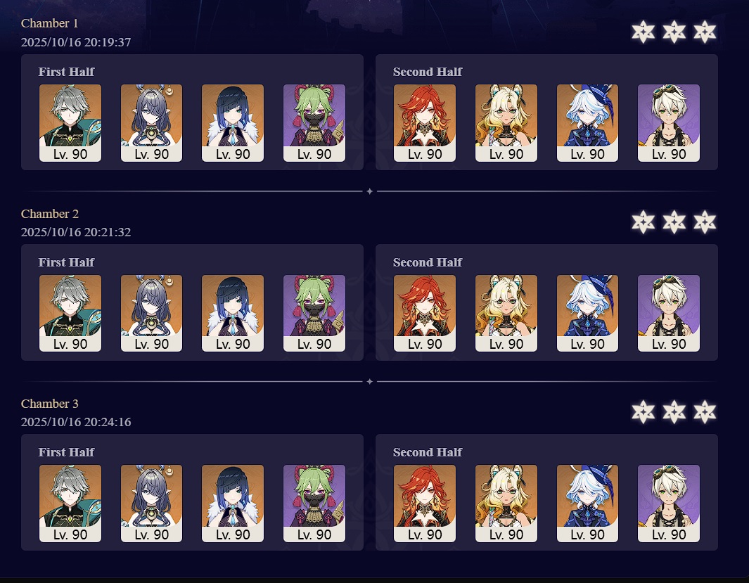 Luna I 2025-09-16 Spiral Abyss StatisticsSample size: 166 (4/gig/ and 8/gig/)Finalized: 2025-10-16Character Usage:https://files.catbox.moe/ppjz0e.pngCharacter Usage (lite mode):https://files.catbox.moe/r40nqr.pngOther Statistics:https://files.catbox.moe/kdgco2.pngCongratulations to these anons for being"4/gig/'s Top 10 SOVLFVL clears of Spiral Abyss 2025-09-16 Luna I"#1. Sample #50 - >>539336807 - 957 points#2. Sample #102 - >>539372921 - 946 points#3. Sample #25 - >>539315921 - 923 points#4. Sample #150 - >>539593386 - 921 points#5. Sample #24 - >>539313494 - 919 points (earlier submission)#6. Sample #43 - >>539325457 - 919 points#7. Sample #146 - >>539557234 - 919 points#8. Sample #156 - >>539698748 - 913 points#9. Sample #122 - >>539456737 - 903 points#10. Sample #5 - >>539301093 - 900 pointsLeaderboard: https://files.catbox.moe/ryff8q.pngHow the ranking is tabulated?Every submissions get 1000 points as default grade,then the grade will be reducted based on voting data of this poll (Vote if you haven't: https://strawpoll.com/B2ZB9wmqAgJ)Submissions with similar grade will then be ranked by the order of submission time (earlier submission gets high rank)Good luck on your next Spiral Abyss, anons!