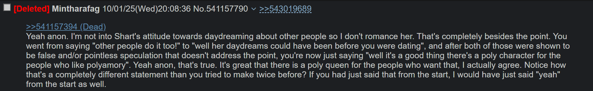 >>543144636I think you just have an intense hatred of that character so you love Mintharafag's posts no matter how asinine his position