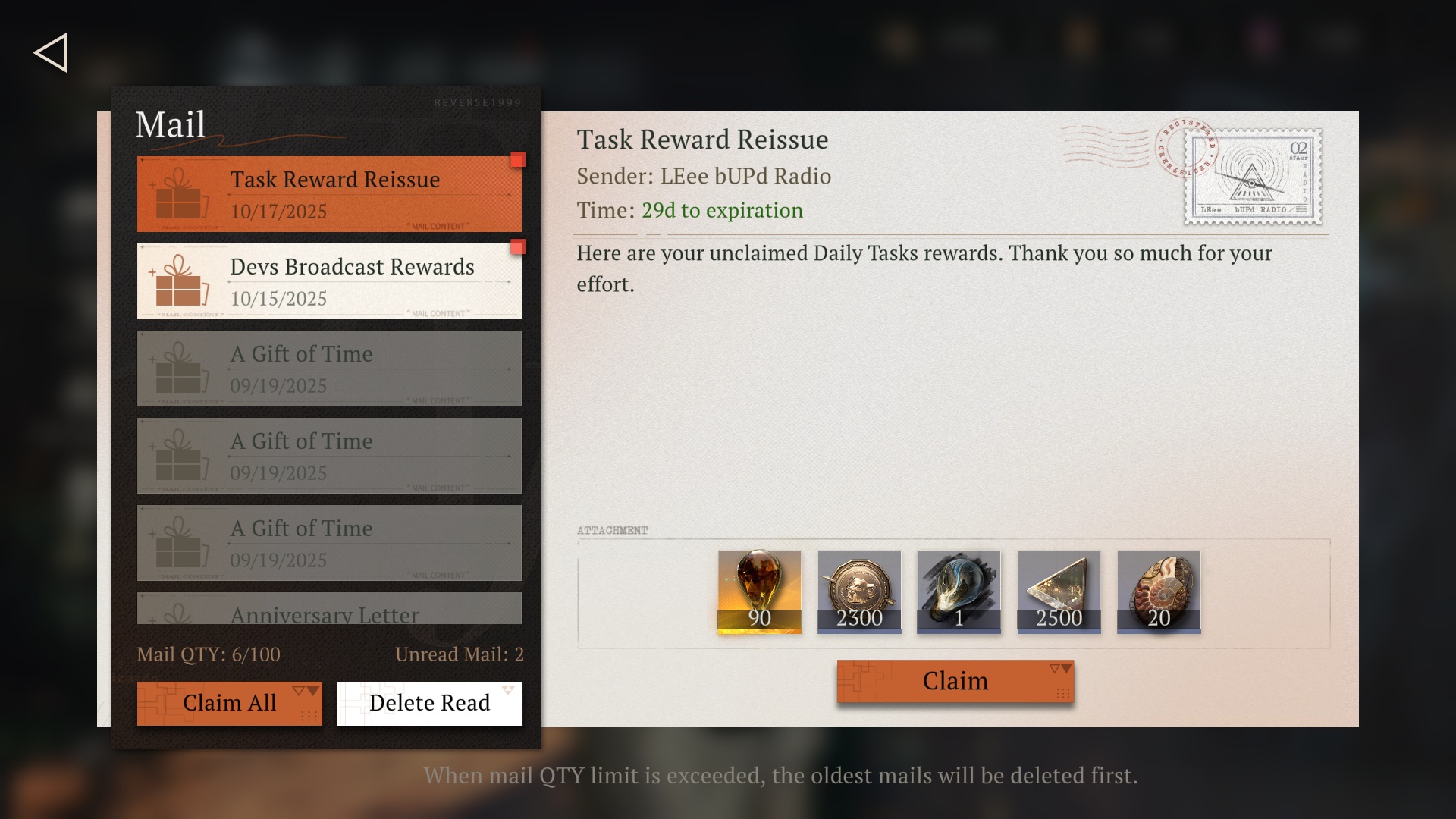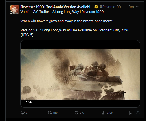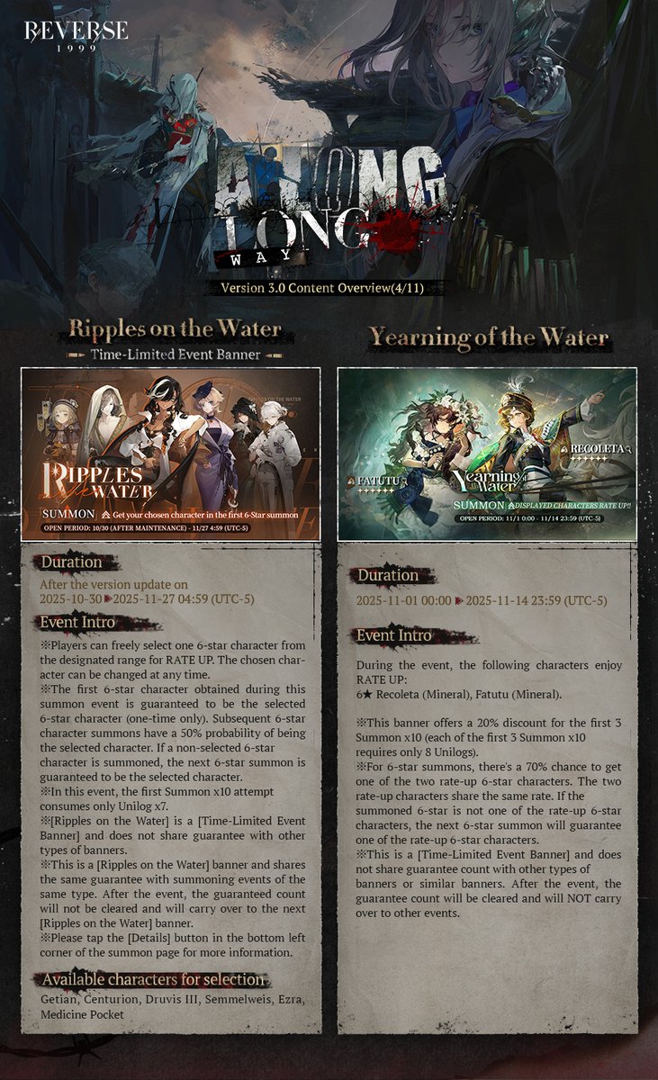 Previous Era: >>542779148>General InfoReverse: 1999 is a turn-based gacha RPG with gameplay revolving around the use of spell cards. The game focuses on storytelling, with a rich main story mode and frequent side-story events. The game is fully voiced in 4 languages, with English as the primary one. There are no PvP elements, you can play at your own pace.Daily reset is at 5AM UTC-5GL 2.8 - http://youtu.be/0fZnlljoor4 | http://youtu.be/GJP4E2RLdPkCN 3.0 - http://youtu.be/20YLmzTQUSkCN 3.1 - http://youtu.be/GjFAnAjGB0M09/19 - 10/27 | PARADISE REGAINED>Current Content09/19 - 10/27 | Against the Flood09/19 - 10/30 | Pre-Storm Protocol (Ulrich Mode)09/19 - 10/30 | In Her Own Reflection (Nautika's Story)09/25 - 10/30 | A Pirate's Guide to Lab Disasters09/25 - 10/30 | Critter Crash10/01 - 10/15 | A Long Way from Home10/09 - 10/30 | A Moment on the White Expanse (Moldir's Story)10/09 - 10/30 | When the Alarm Sounds10/13 - 10/23 | Double Analysis10/13 - 10/23 | Projecting Desargues>Upcoming Content10/23 - 10/30 | A Letter from No Man's Land (3.0 Tease)>Current Banners09/19 - 10/30 | ⧖ | Nautika (Spirit DPS) | http://youtu.be/UwBoJQ-g8GI09/19 - 10/30 | ◈ | Euphoria Rate-up 1x100%: Ezra, Jessica, Melania, M.Pocket, Regulus, Semmelweis10/01 - 10/15 | ◷ | Lucy (Intellect DPS)10/07 - 10/21 | ⟳ | Lopera (Beast Support)10/09 - 10/30 | ※ | Moldir (Beast DPS) | http://youtu.be/vKWhDpY59rg>Upcoming Banners10/21 - 11/04 | ⟳ | J (Beast DPS)10/30 - 10/?? | ※ | Sentinel (Mineral DPS) | http://youtu.be/MvpUd5IOrvc>[ Download ] http://re1999.bluepoch.com | http://store.steampowered.com/app/3092660>[ Resources ] http://rentry.org/1999-resources>[ Merchandise ] http://reverse1999.store>Codes1999GIFT, 5YRBRF9, GachaGaming1999, EndsOfTheEarth, UnforgettableNight, GazingIntoAbyss, UnbreakableAxe, TheMotherSpirit, 1999Happy2ndAnniv, NoWayBack