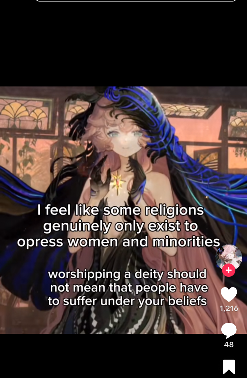 >>543063324>>543063569For me the issue is how one-dimensional and hypocritical the statement is. What religions are they referring to? Which are oppressing minorities? Because when it comes to "oppressing women" basically every single known and written about religious leader has deemed women to be inferior or at least naturally subordinate to men. I agree with the overall sentiment in the second sentence, but this view is the view of a sheltered, immature, terminally online person with no world experience.