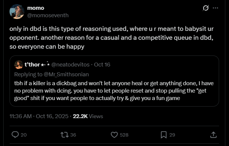 >>542954497>>542961806This is actually pretty huge. It took a year, but the fact that there’s finally PvP means they’re going to start actively encroaching on DbD’s turf, which naturally means a fire lit under the ass of BHVR since people by and large actually like what this team is doing with their game. Once we get to play as the named killers complete with their own versions of perks and whatnot (which shouldn’t be far off now), it’ll easily be the biggest and longest lasting competitor, although it helps they weren’t retarded enough to go for the asymm route.
