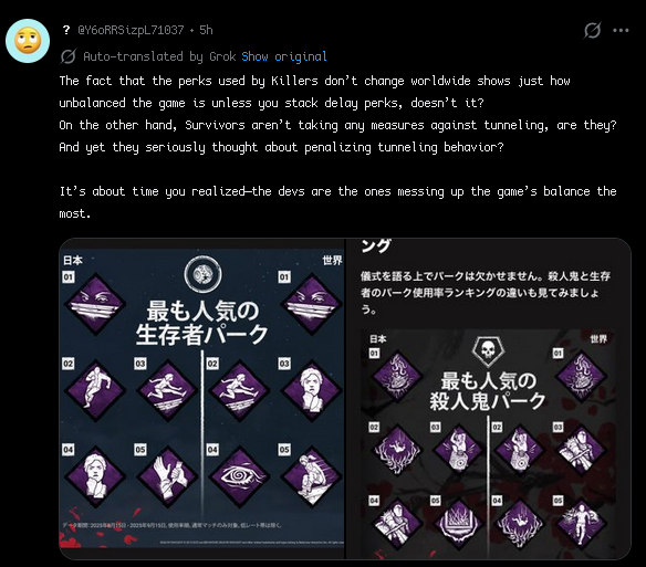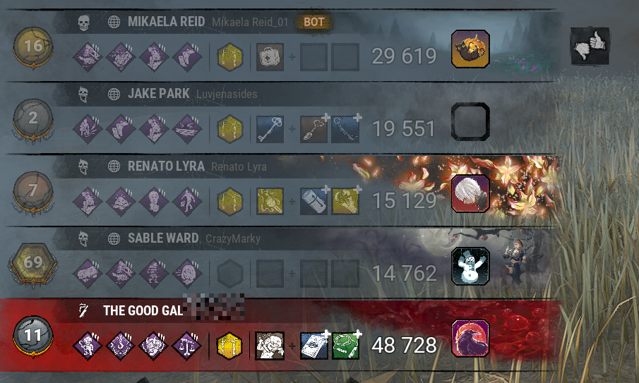 I just watched the first two games of Otz's video, showing how the past metas and game state were even worse for killer than it is now. I only watched the first two matches because they set such a bad example there's no point watching the rest. There's something underhanded he neglects to mention, and which oddly, nobody in the comments brings up: these games are from challenge runs where he has either no or few perks. It's just an elephant in the room you're expected to overlook. Ghost Face, with just Lethal Pursuer and Fire Up, only got 2k? It must have been those damn self unhooks with the oppressive slippery meat and up the ante perks! And wow, Pig with no perks or add-ons at all got only 1k? How could this happen? It was that damn Claudette with the notorious Dramaturgy and Finesse combo making shack just impossible for even a killer like Pig with one of the worst chase powers in the game, no perks, and no add-ons! What a fucking stupid video.