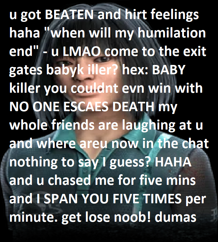 >>542984123Cause keeping the killer hostage for 2 minutes (4 if someone uses plot twist on purpose) is fine becasue the killer can just push them out bro! (Even if 1 its mentally exhausting and annoying 2 you have to hit them 12 times, cause each survivor will bodyblock untill they are down (and they fall out the exit when falling on the floor). But survivor having to see the killer mori you? NO, THATS BAD AND WRONG THEY NEED TO ABANDON, THEY DONT WANT TO SEE IT
