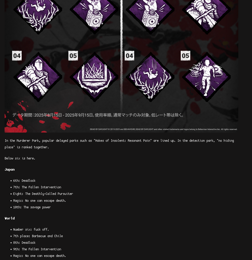 Kick the baby edition>What is Dead By Daylight?Dead By Daylight is an asymmetrical multiplayer (1v4) horror-styled game where one player takes on the role of the Killer and four players take on the role of Survivors. The Survivors' objective is to repair generators in order to power and open exit gates to escape. The Killer's objective is to kill the Survivors.▶ NEWS>Halloween Eventhttps://deadbydaylight.com/news/haunted-by-daylight-2025-everything-to-know/>9.2.2 | Bugfix Patchhttps://forums.bhvr.com/dead-by-daylight/kb/articles/525-9-2-2-bugfix-patch>Official Stat Tracker Websitehttps://stats.deadbydaylight.com/▶ RESOURCES & INFORMATION>Official website:https://www.deadbydaylight.com>Patch Notes:https://forums.bhvr.com/dead-by-daylight/kb/patchnotes>Wiki:https://deadbydaylight.wiki.gg/>>542656717 banned for implying Victor is under 18