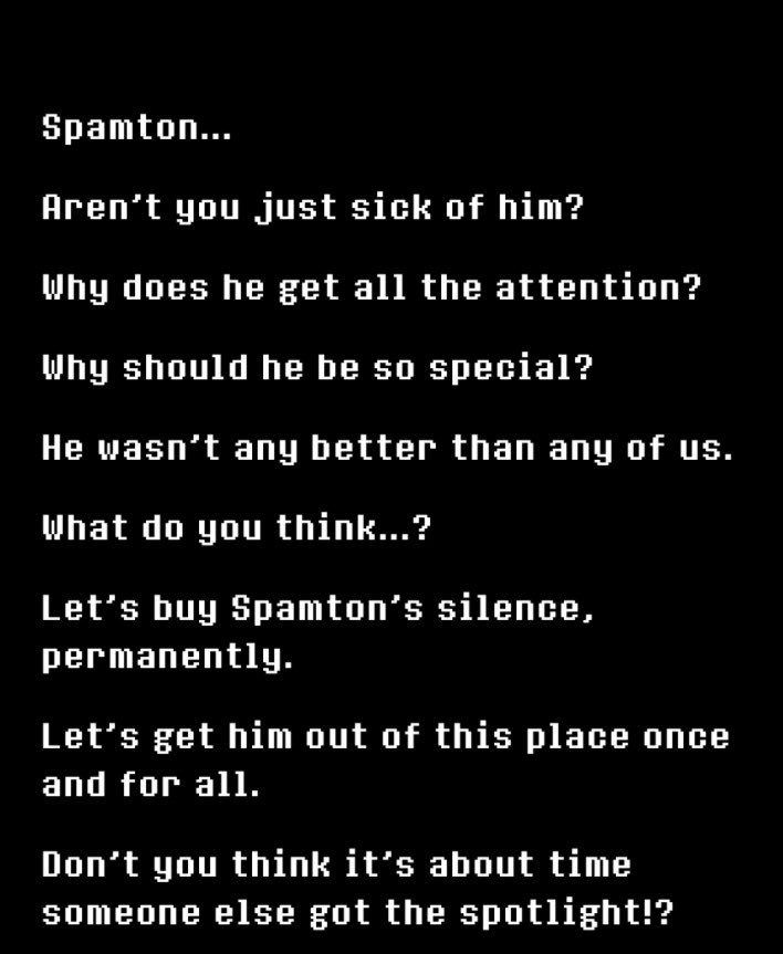 >HE SHOWERS OUR SOULS WITH INCREDIBLE DEALS>AND WITH HEARTY PEEPIS, OUR HEART HE SO STEALS>NO FOOL WOULD BE GREATER>THAN HE WHO DENIES>THAT SPAMTON GIVE ME THE CHANCE TO EARN WILD PRIZE>NOT A CIRCUS CLOWN, WHO'S MORE SICK THAN HE FUNNY>A LOVEABLE SALESMAN, WHO GIVE ME FREE MONEY>YOU MAY ASK, "WHO IS NEXT?">YOU MAY ASK, "WHO WILL BE?">"WHO WILL BE SECRET BOSS OF ADVERNTURE NO. 3?">ME DON'T KNOWS. AND ME DON'T CARES!>ME ONLY CARES ABOUT SPAMTON>THE REST CAN GO UP IN THE AIRS!!Please pay $4.99 to continue the poem.
