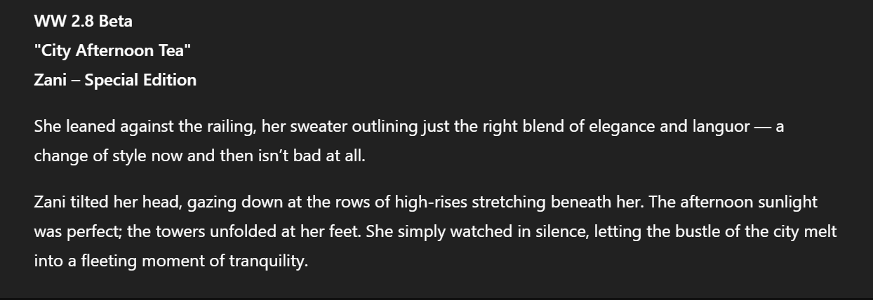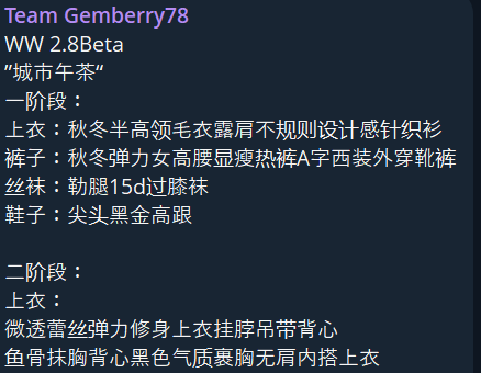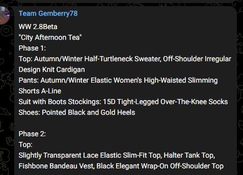 ZANI SKIN DESCRIPTION:WW 2.8Beta>“City Afternoon Tea”>Phase One:>Top: Fall/Winter half-high neck sweater with off-shoulder asymmetrical knit design>Pants: Fall/Winter stretch high-waisted slimming hot pants, A-line suit-style outerwear bootcut pants>Stockings: 15d thigh-high stockings>Shoes: Pointed-toe black and gold high heels>Phase 2:>Top:>Sheer lace stretch fitted halter-neck tank top>Fishbone-patterned strapless bustier top with black elegant wrap-around strapless inner layer