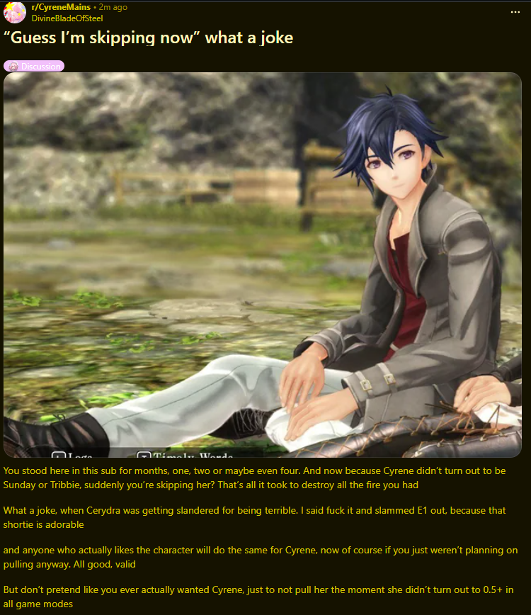 Let's be realistic, nobody who already decided that they like Cyrene will skip her just because her kit is shit. She WILL sell and she WILL get a ton of shilling in the form of in-game incentives. Even if you yourself don't roll, there will be a rich chink fag that will roll 33 million copies of her.
