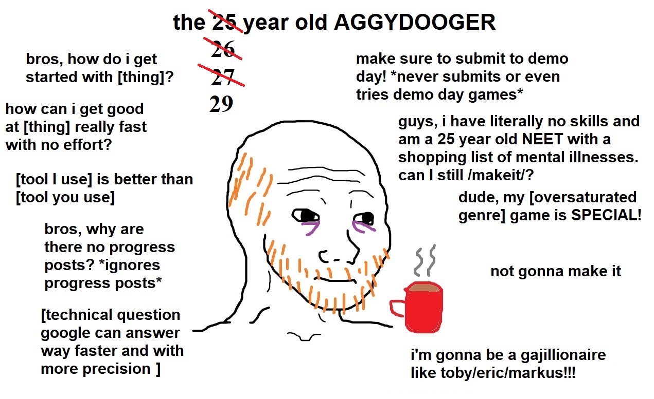 normie life is poor preparation for the jobby of gamedev.>school -> college -> degree -> job -> make a decent livingthis generally works. same with other normie pursuits like going to the gym or building your credit score.but gamedev doesn't respond predictably to hard work. you can be smart and work hard and still flop. or you can be a retard and make a game that appeals to other retards and be set for life.I don't know if this is encouraging or discouraging because I'm a hard working retard.