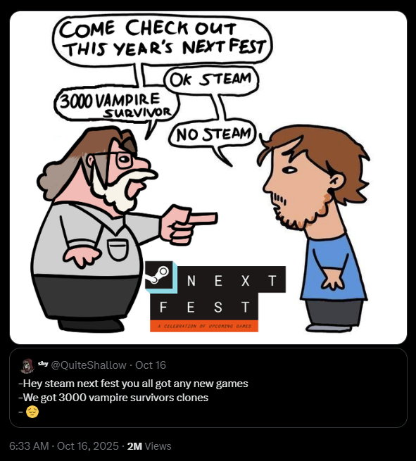 >>543019462>steam shillSteam explicitly tells devs to market their games themselves https://partner.steamgames.com/doc/marketing/bestpracticesso I don't think whoever says "just make good game" is a steam shill I think they just actually have no idea how steam works and think launching a game and hoping it gets discovered on steam and somehow goes viral from word of mouth is a thing.