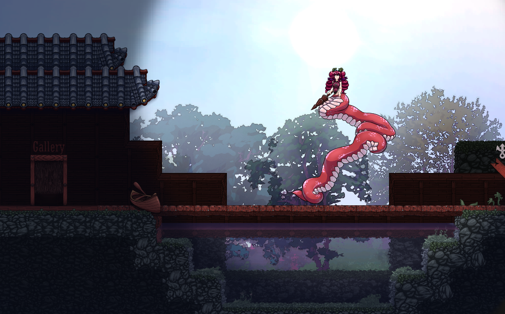 >>543102873>post gameCurrently working on making the player character also be able to have a snake tailthe thing that's currently fucking with me is gravity and how that one end tail piece doesn't connect with the ground so it looks like she's floating. it looks silly regardless but at least it works