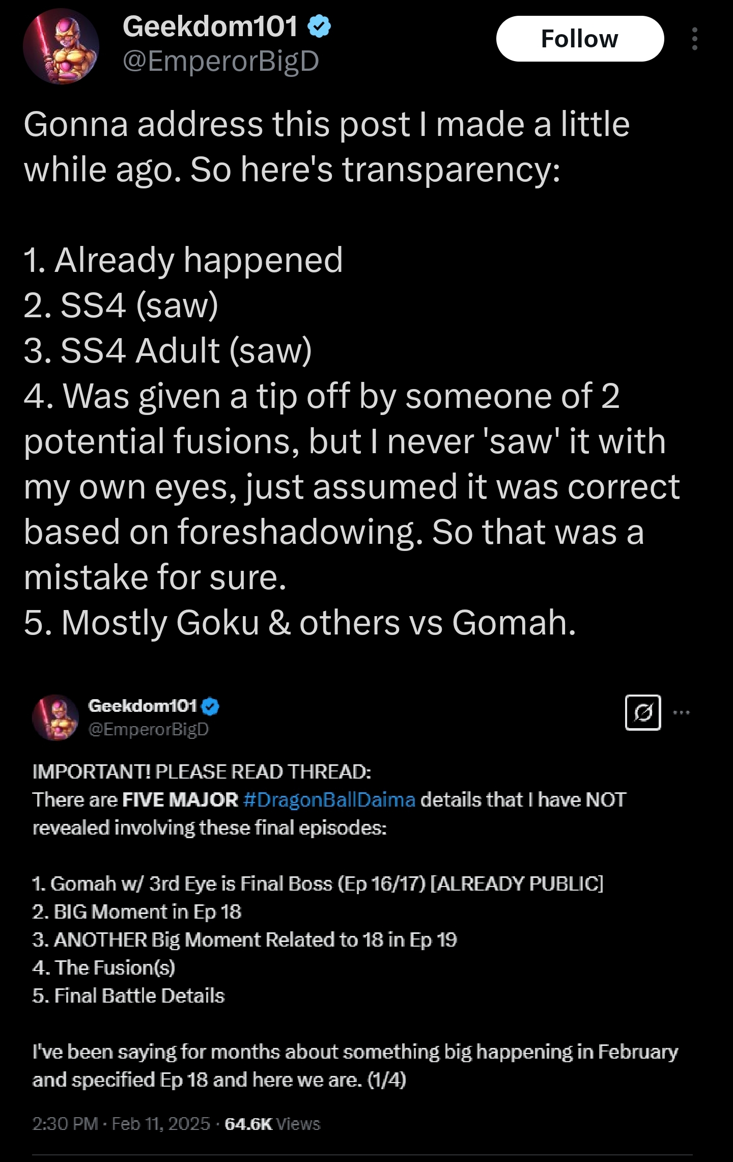 >2026 January>Akio announces Dragon Ball: Sadala>It's a 25 episode mini series that takes place shortly before Super Hero>Cabba, Champa and Vados show up to earth one day to invite the cast to a trip to Universe 6 (Cabba wants to thank them for saving their universe and Champa wants to rub U6 being in a better state in Beerus' face)>the first few episodes deal with U6 Earth, Namek, and various other planets and races that U6 shares with 7>they finally land on Sadala and are royal VIP guests>It looks like a slightly fancier version of Planet Vegeta in the Broly movie>the U6 Saiyans don't look like twigs anymore>Super Saiyan has been a thing in Sadala since Cabba introduced it and Caulifla simplified it and now everyone can go up to SS3 (insert gag about there quite literally being a super saiyan bargain sale and children going Super Saiyan 3 for the pettiest reasons)>There is a royal family and the princess is literally Mereleona from Black Clover and she takes a liking to Yamcha>Sadala is about to be taken over in a coup by cultist that want to abandon being noble crimefighters and return to monke, and it is led by canon remade turles>Instead of there being a Super Saiyan God there's a Super Saiyan Demon/Devil and a ritual to invoke it>canon remade turles takes part in it, becomes it, gets taken over by it and the transformation turns him into a xicor-like monster>Goku and Vegeta bring Super Saiyan 4 out of nowhere use Fuwa's potaras and become SS4 Vegito and save the dayVegito fails, Goku combines SS4 and MUI and turns into a sorta-SS5Early 2027 Alternatively, a cooler movie where Cooler's Zarbon and Dodoria are Turles and Slug.