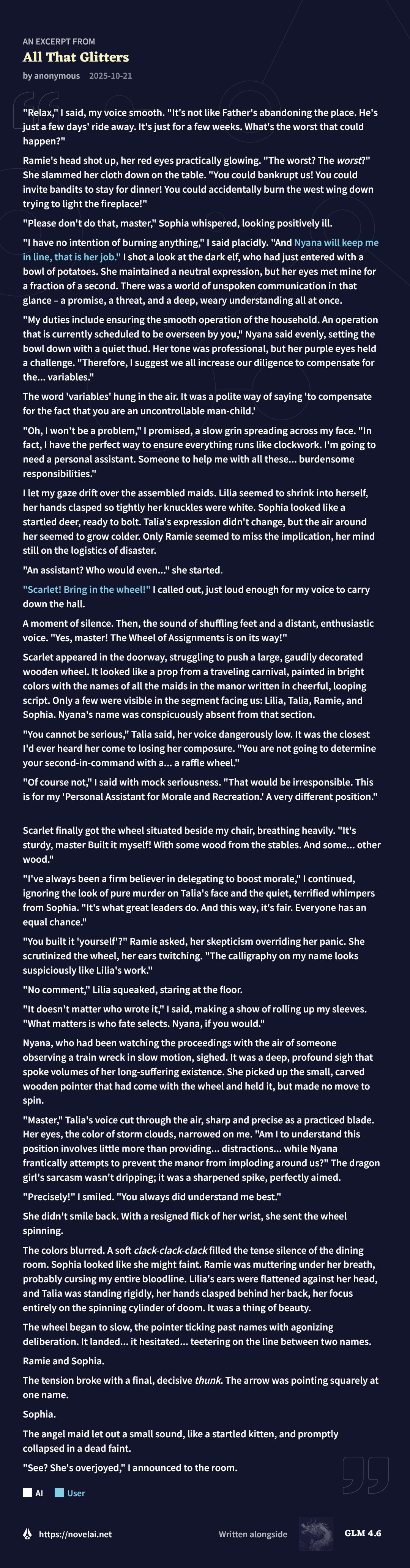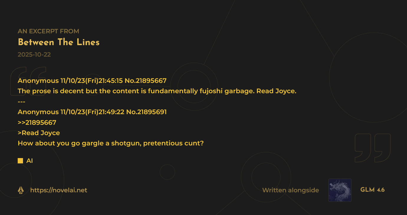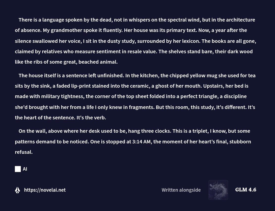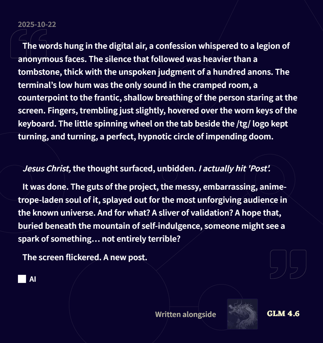 Why Me EditionLast Thread: >>542467803>Read First: https://i.imgur.com/lwWTTp9.png>PSA: https://rentry.org/AntiwhineMkIII▶Cloud Serviceshttps://featherless.aihttps://novelai.nethttps://openrouter.ai▶Frontendshttps://koboldai.org/cpphttps://sillytavern.comhttps://gitgud.io/mir/storypad-qthttps://github.com/lmg-anon/mikupad▶Additional Information>Chat Models — e.g. AetherRoom, Claude: >>>/vg/aicg>Local Models — e.g. Command R, Mistral, Qwen: >>>/g/lmg▶Game(s)https://store.steampowered.com/app/1889620▶Tools & ResourcesWiki: https://aids.miraheze.orgPrompts: https://prompts.forthisfeel.club/NAI Guide Collection: https://rentry.org/guide-collectionOther/Historical: https://rentry.org/aids-miscellany>AID: https://rentry.org/remember-what-they-took-from-you▶/aids/ EventsThemed Prompts: https://aids.miraheze.org/wiki/Theme_Fridays>Theme Fridays have transformed into Theme Months!>Write prompts for this month's event, Monster Month! It's not actually Horror Month, please ignore the last OP that claimed it was Horror Month, the baker responsible has been sacked. >>541595997▶Model News>(10/01) Z.AI releases GLM-4.6: https://z.ai/blog/glm-4.6 ; NovelAI updates untuned preview to GLM-4.6: https://novelai.net/updates>(09/29) Deepseek releases Deepseek-V3.2-Exp: https://api-docs.deepseek.com/news/news250929 ; Anthropic releases Claude Sonnet 4.5: https://www.anthropic.com/news/claude-sonnet-4-5>(09/26) NovelAI releases GLM-4.5 (Untuned Preview) for Opus: https://blog.novelai.net/text-model-release-introducing-glm-4-5-untuned-preview-for-novelai-opus-4aa866c8a0d5>(09/11) NovelAI releases Character Reference: https://files.catbox.moe/08fdu6.png>(08/21) DeepSeek releases DeepSeek-V3.1: https://x.com/deepseek_ai/status/1958417062008918312▶Thread News>(10/17) Emacs Update: >>543061369 – https://files.catbox.moe/fkzq51.el