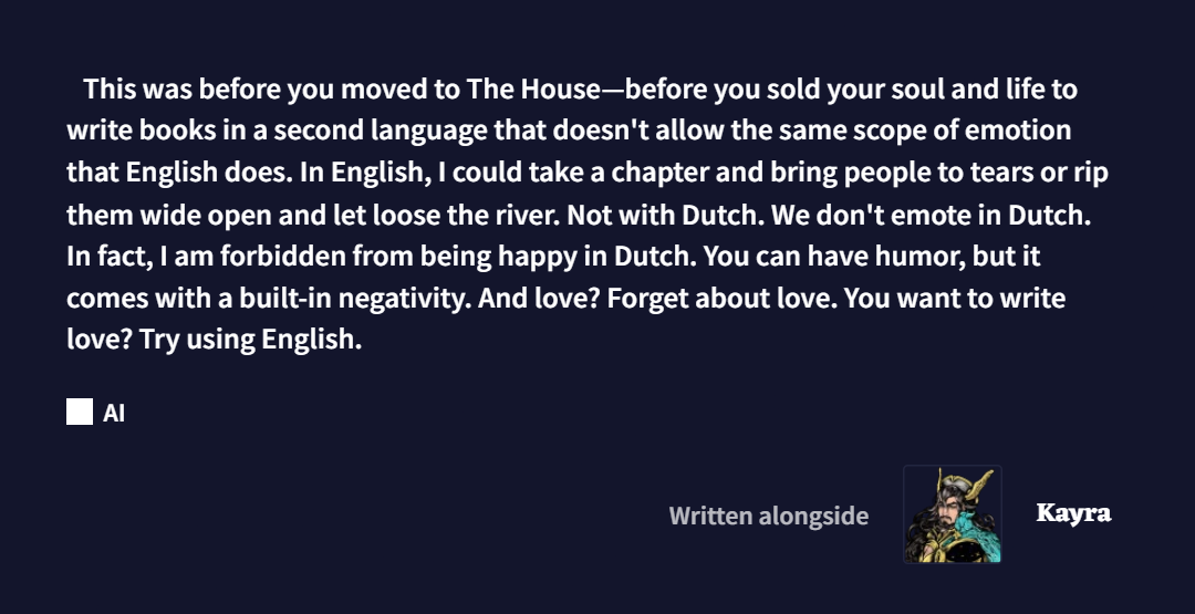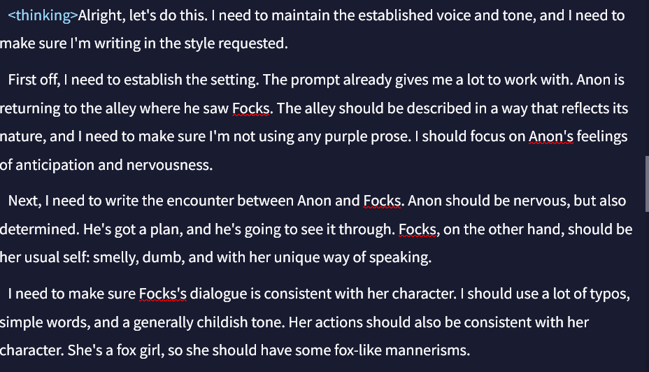 >>543133078I have had that happen a small handful of times, unfortunately, but not too often for a story that's 200k words in. One of them actually explained itself as the character slipping into Sinnohian or something in his excitement, which was neat enough to almost keep.From what I can tell, since sometimes it'll try translating afterwards, they make sense in context, they just, well, aren't in English. I am slightly surprised that there isn't something in the system prompt and prefill or something about trying to keep responses in the same language as prompted unless prompted otherwise, but things likely don't quite work that way.