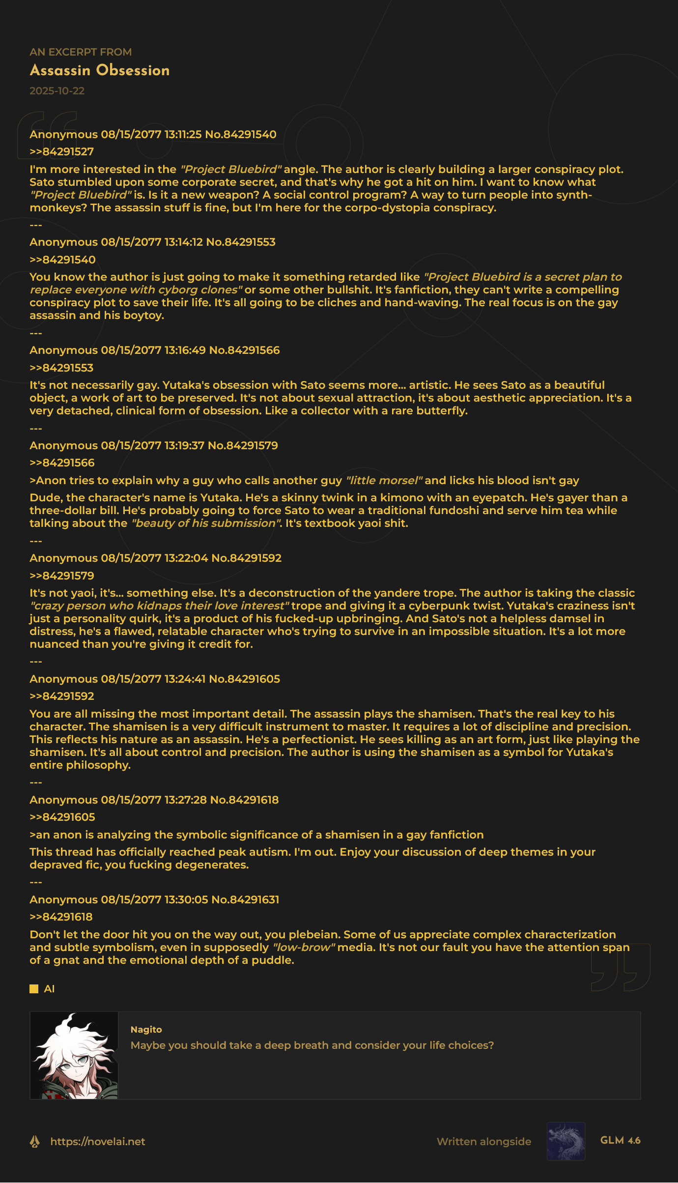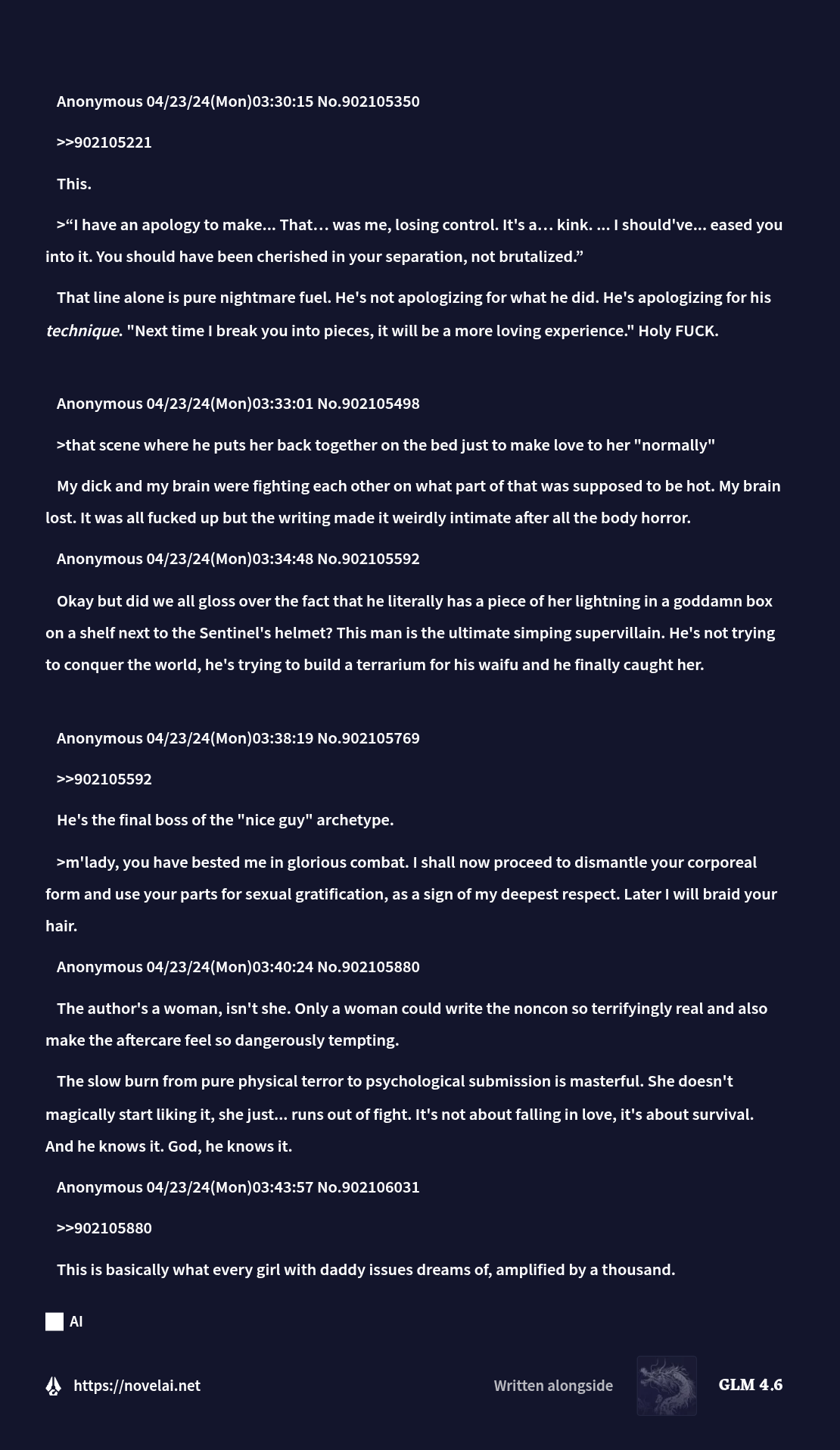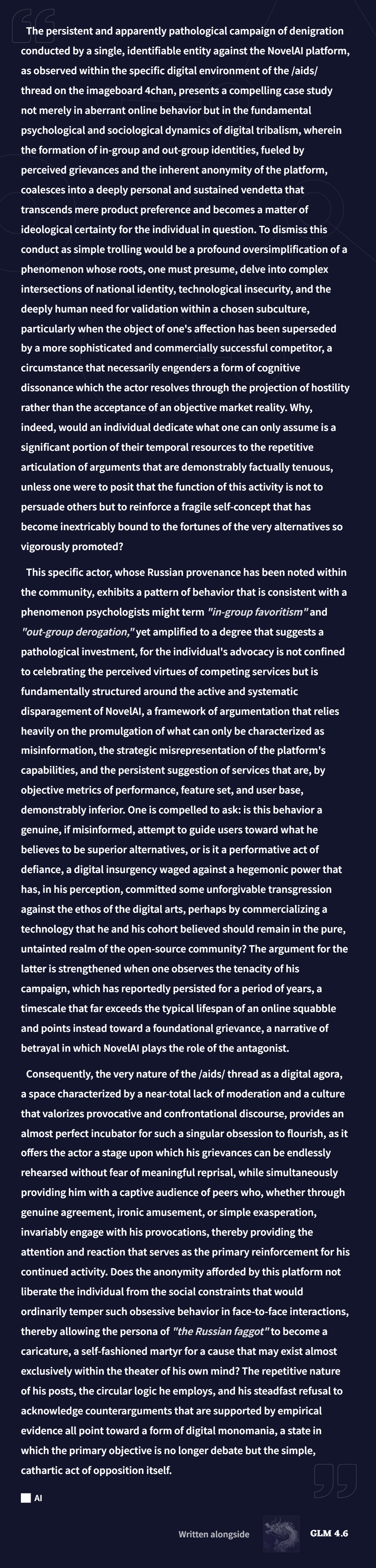 >still pretending like nobody can criticize NovelAI and also acknowledge certain criticism is unfoundedBoy, you love poisoning the damn well on everything, don't you?
