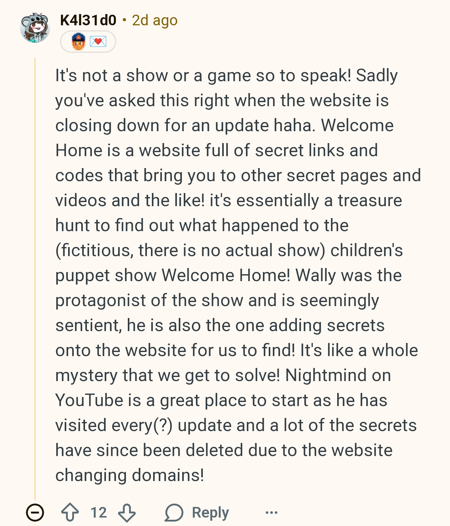 >>543808225I like how the reddit faq felt the need to have several paragraphs about whether or not it's an ARG. I'd like to imagine this is a heated debate in the community.https://www.reddit.com/r/WelcomeHomeARG/wiki/faq/