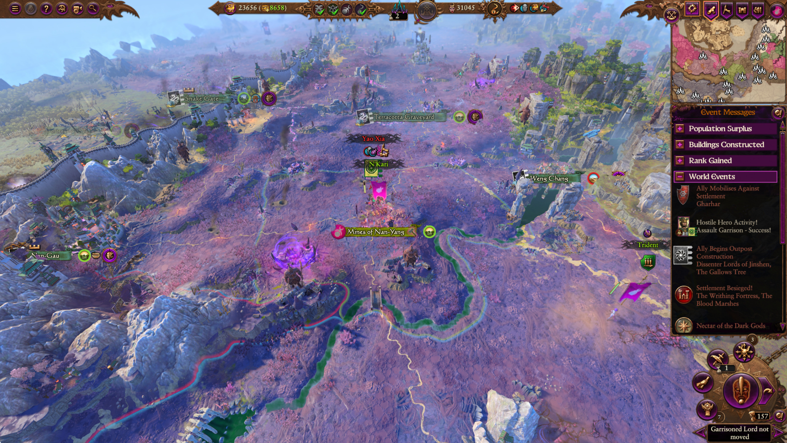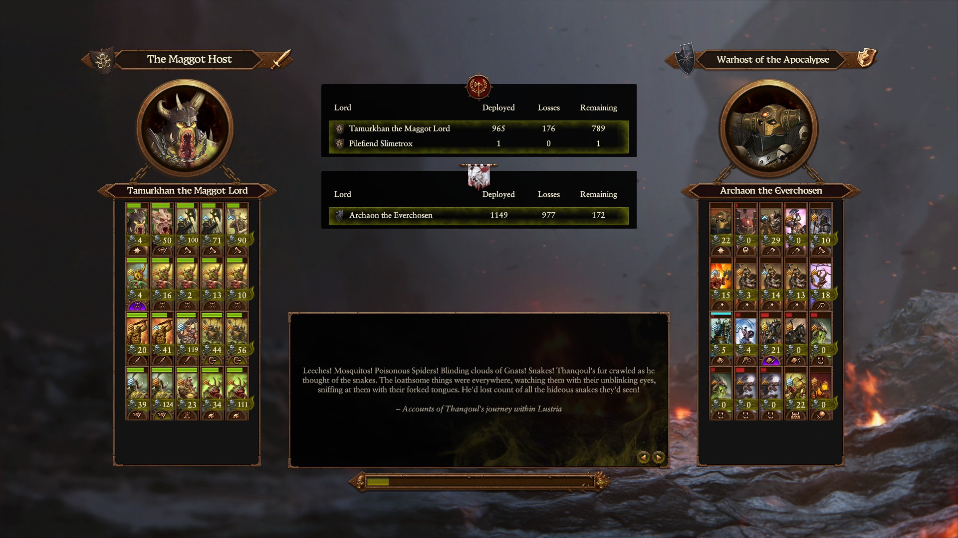 Finally finished my modded Tehenhauing campaign in WH2. Unnatural selection mod to purge Lustria of anything but rats and lizards, then boosted Ikit/Skrolk to max and gave all factions starting Tier 5 citiesA very fun campaign, probably one of the best I ever had. Some actual challenge. Pic related happened like five times.It really felt apocalyptic, with 10+ skaven armies running around, me using rite of sotek attrition and them twice spreading plagues that nearly led to the fall of two of my main settlements.Some highlights included>kino battle with my 1 Tehenhauin stack vs Ikits 2 stacks early in the campaign>Gor-Rok basically defending against a three stack siege of Itza by himself>summoning a primeval glory army just as two skaven armies were marching on my capital>multiple defensive sieges at Xlanhuapec and Tlaxtlan>Kroak and Gor-Rok vaporizing any stack they foughtAll in all, if the unnatural selection mod still works in 3, I would highly recommend playing around with it. Im not touching 3 until CA is done with it, but I understand not everyone is as autistic as me.