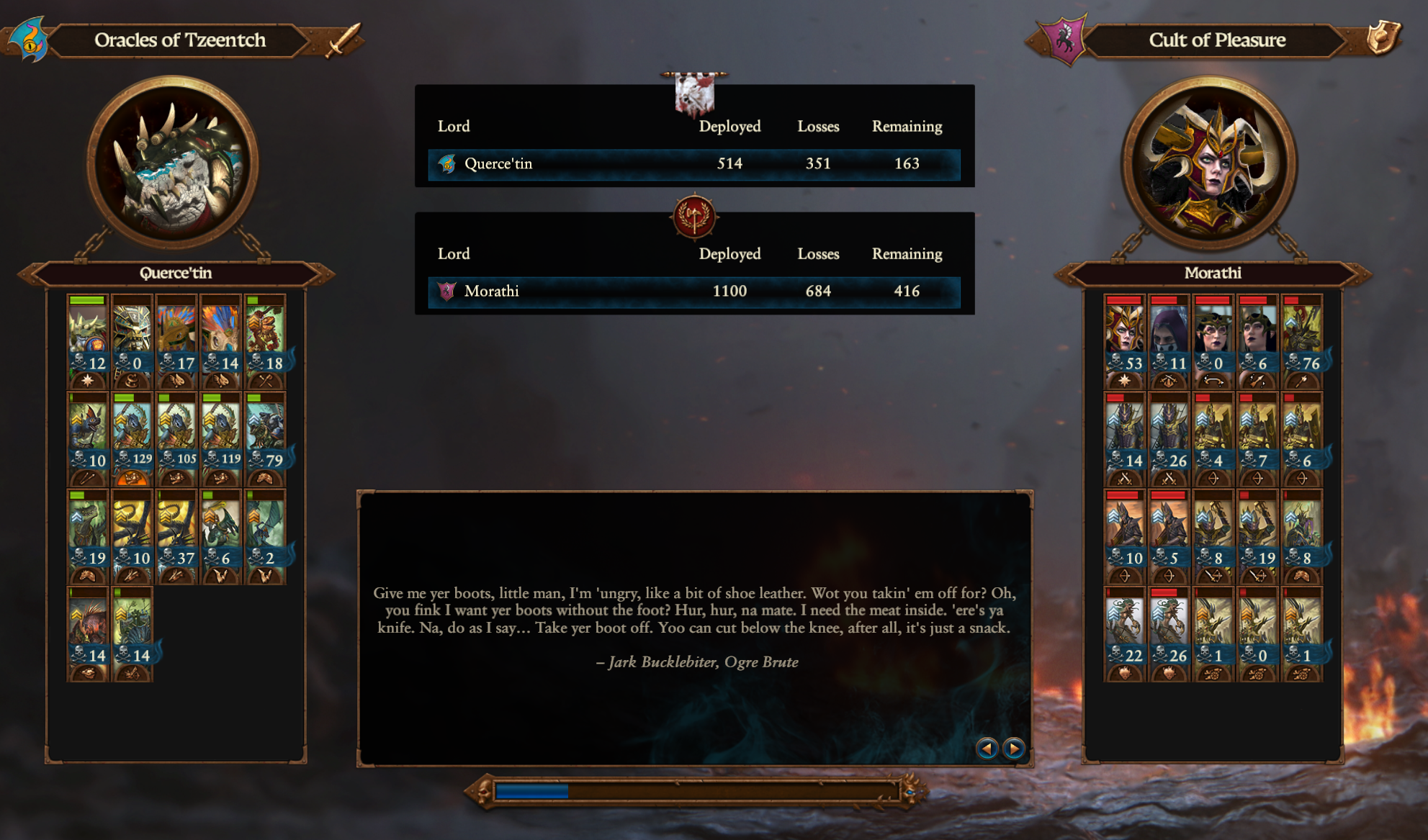 >>543217667He still wins half the time anyway due to how Raise Dead works>Vlad raises shitstack>It gets obliterated by Elspeth's bullshit ranged>but it makes a fuckhuge corpse marker because Vlad lost 18 units of skeletons/zombies>Vlad comes back a turn later with Blood Knights and Terrorgheists and rapes half the empire because he got a deathstack on turn 10>>543217745At least with Chorfs there's unit caps on the other artillery to justify it. IIRC Greenskins get Rock Lobbers from the same building and they're much better if you aren't fighting SEM spam. I think having more models in the unit skews the value assessment.