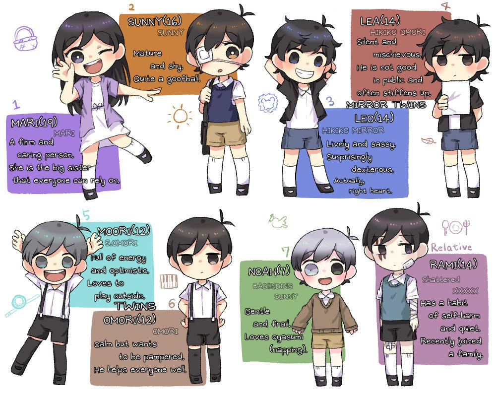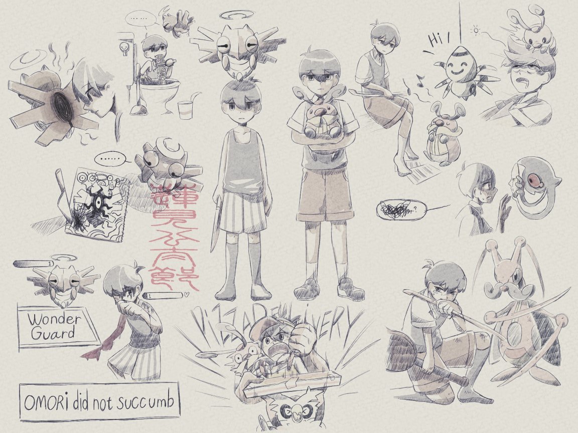 what i imagine sunny's pokemon team would be>general themepokemon with dream/nightmare qualities, so mainly psychic and dark types>musharnadream themed pokemon, self explanatory>absolhe somehow found one after mari had passed, and liked it for being like a cat. absol also has the ability to predict disasters which maybe relates to him a bit>slowbrohe might like it because it's kind of lazy and dozes off a lot>meowstic (male)psychic cat. the male ones have a calmer temperament and more protective qualities, which i think sunny could get along with.>kricketotit was a gift from mari, who i like to think mainly used bug types. he doesn't use this one in battle, but when sunny accepts the truth it evolves into kricketune.i can't think of what the last one would be (maybe mimikyu?) so i'll just pretend he only has 5