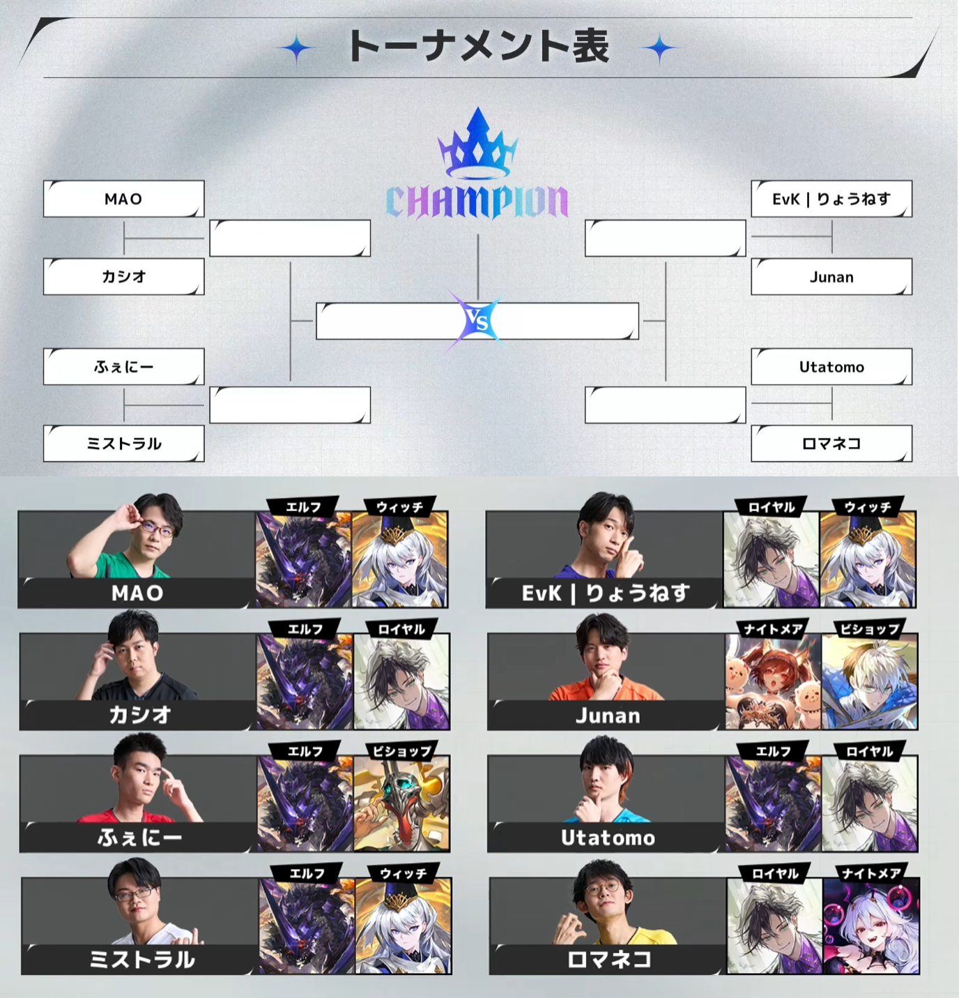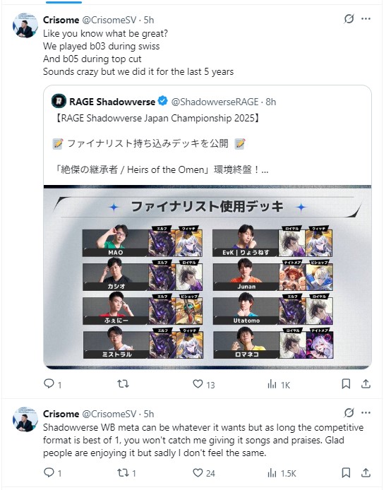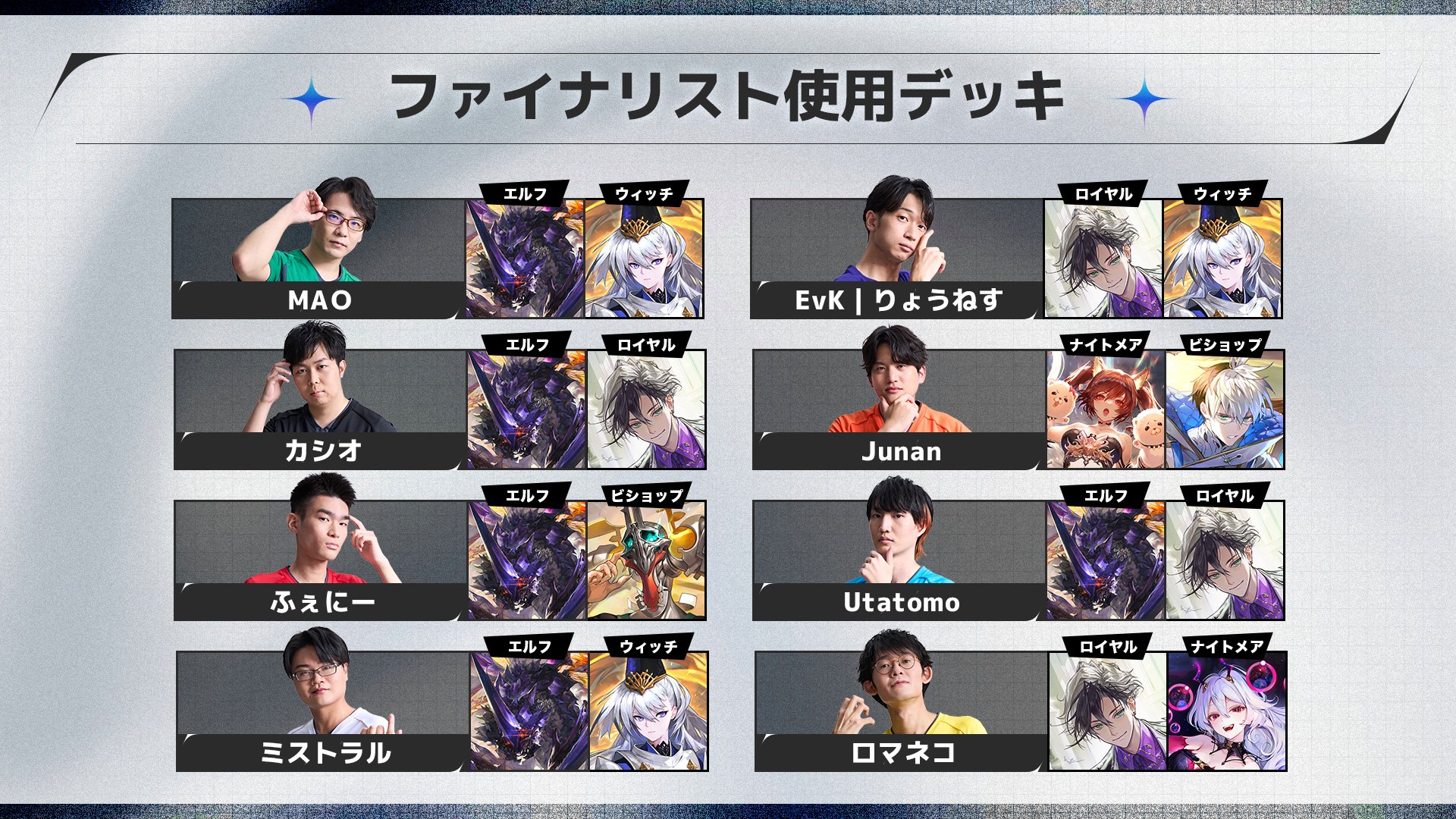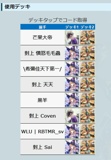 >>543195985deck>ロマネコ loot + mode>Utatomoroach + loot>Junanmid abyss + crest>EvK|りょうねすloot + spellboost>ミストラルroach + spellboost>ふぇにーroach + crest>カシオroach + loot>カシオroach + spellboostcomplete decklist on each player pagehttps://rage-esports.jp/shadowversewb/