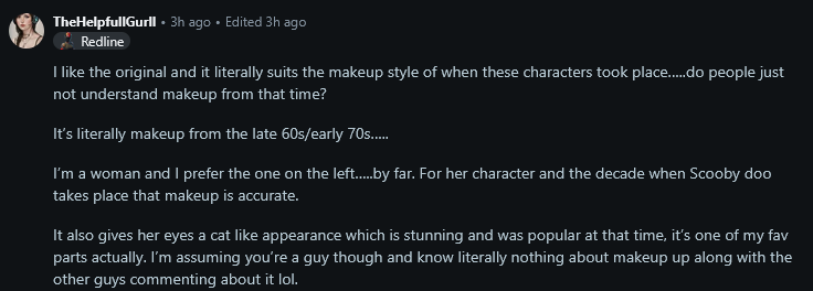 >>543275028>modernized designs>it's accurate for the 1970s>not even accurate to Daphne's normal makeupfucking retard