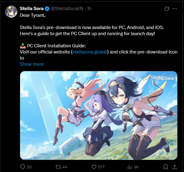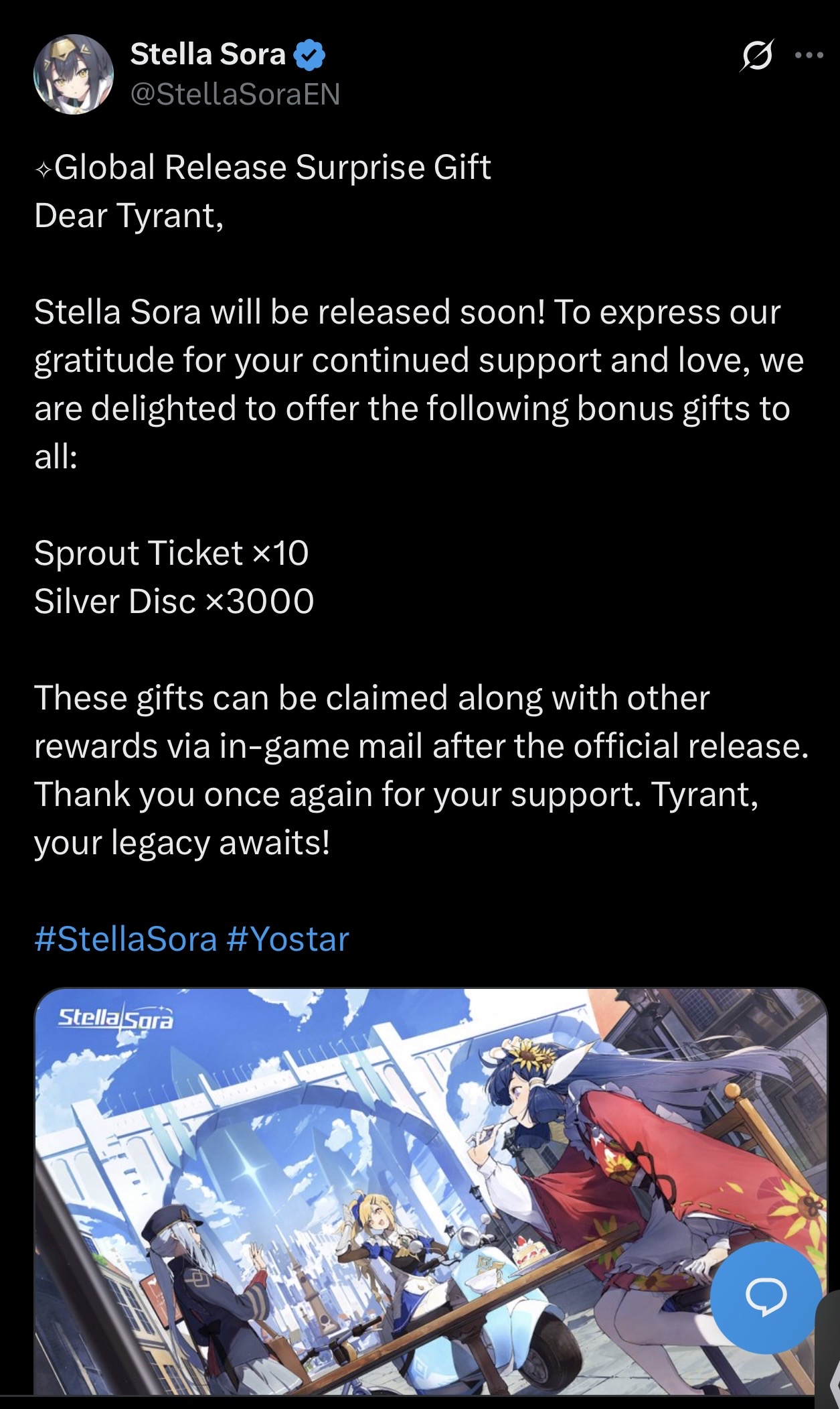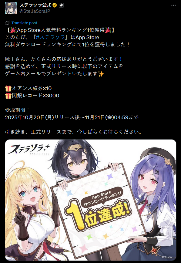 Pre-Download now Available! The game>https://stellasora.global/ Release Date>Sun October 19th 19:00 (UTC-7) Countdown>https://www.timeanddate.com/countdown/generic?iso=20251019T19&p0=137&msg=Stella+Sora+Release&font=serif Pre-Release Info>https://rentry.co/PreReleaseSoraInfo Release PV>https://www.youtube.com/watch?v=zyiEq1_IzdE Last Trekker Commission>>543168263
