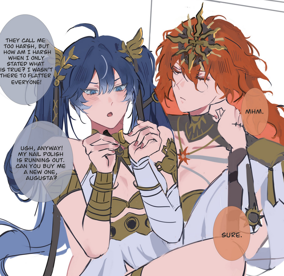 Augusta herself still feels designed for yuri fans. I think she was always intended to sell that dynamic, but the Sun/Moon ship got cut. Kuro might now push Augusta × Gabe instead—it fits the “childhood friend vs. new arrival” trope and both designs appeal to yuri audiences. We’ll see in 2.7.