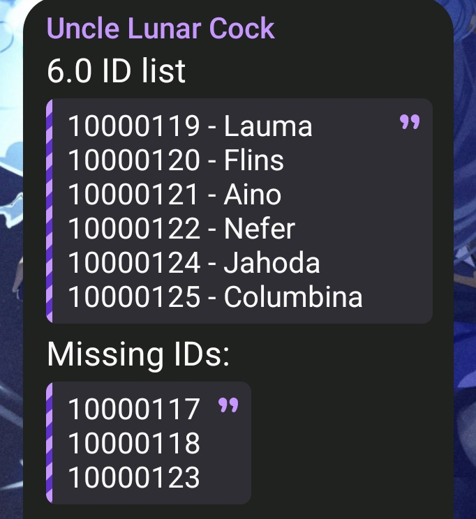 Congratulations /gig/!Previous: >>543274713 >Character Teaser - "Nefer: An Inevitable Inconsistency"https://youtu.be/egKU8L59cCQ (EN)https://youtu.be/ohV402u_eGE (JP) >Character Anecdote - "The Gem Scam"https://youtu.be/46q9MNa50Yo >Miliastra Wonderland: Version "Luna II" Legendary Set Trailerhttps://youtu.be/nZA0vvO6EbU >Version "Luna II" "An Elegy For Faded Moonlight" Trailerhttps://youtu.be/w50jW_iEXns (EN)https://youtu.be/x-8hTneUDlY (JP) >5th Anniversary Theme Song: "The Long Way Home"https://youtu.be/OvHwco4OxDo >Current character banner: Flins, Yelan, Aino, Sucrose, Dori>Current weapon banner: Blood-Soaked Ruins (Polearm), Aqua Simulacra (Bow)https://www.hoyolab.com/article/41345237 >Daily check-in rewards (permanent)https://webstatic-sea.mihoyo.com/ys/event/signin-sea/index.html?act_id=e202102251931481&lang=en-us >Redeemable Codes with Primogems (all regions): https://genshin.mihoyo.com/en/giftGENSHINGIFTEPIC2025R4SCAU7CR1G9 >Useful Links (Wiki, Simulators, Maps, Character Builds, /gig/ friendlist, Third-Party Tools, etc.)https://rentry.org/giglinks /gig/ OP pastebin (use this if making new thread):https://pastebin.com/ca0zseQ9