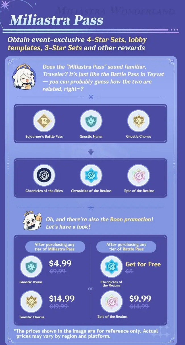 i think i finally understand the bullshit with the battle passes discountits basically the miliastra pass is a cheap 5 dollar pass, where as the genshin one is 10, so if you buy the normal genshin one you get the cheap miliastra pass for free, but if you buy the 5 dollar cheap one you gotta pay 5 more to unlock normal battle passso i was right, basically the UGC battle pass is free if you get the normal genshin battle pass