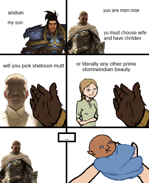 Every "male" human in WoW is compromised and needs to be replacedAnduin and Shaw are queersKhadgar is a crippleDanath became a liberal soiboyEven Turalyon isn't safe he's either being villain batted or is doomed to play second fiddle to Strong Womyn Alleria and her son