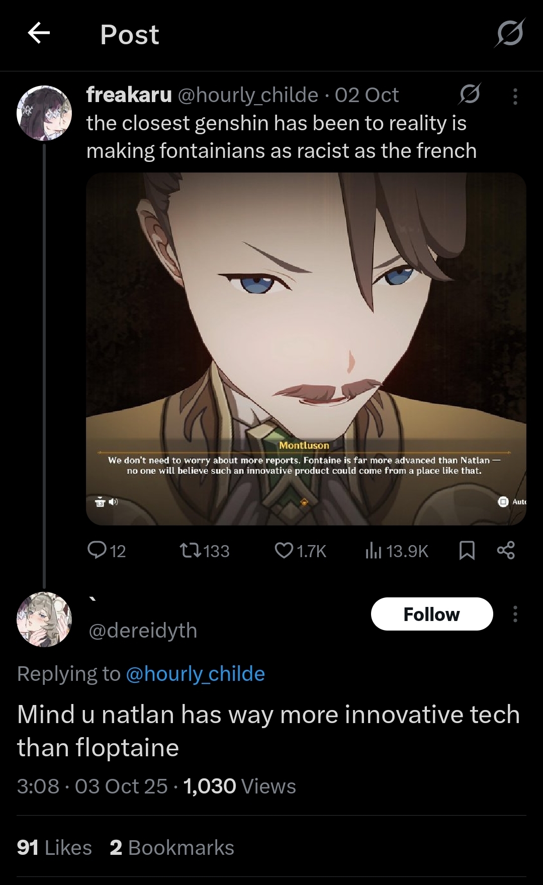 >>543313408>>543313596The possibility is there. Captain Grosrochard of the Gardes is mentioned by several playable characters on top of introducing Chevreuse.But will Hoyoverse seize it and revive Arlecchino and Clorinde's usage rates in one fell swoop?