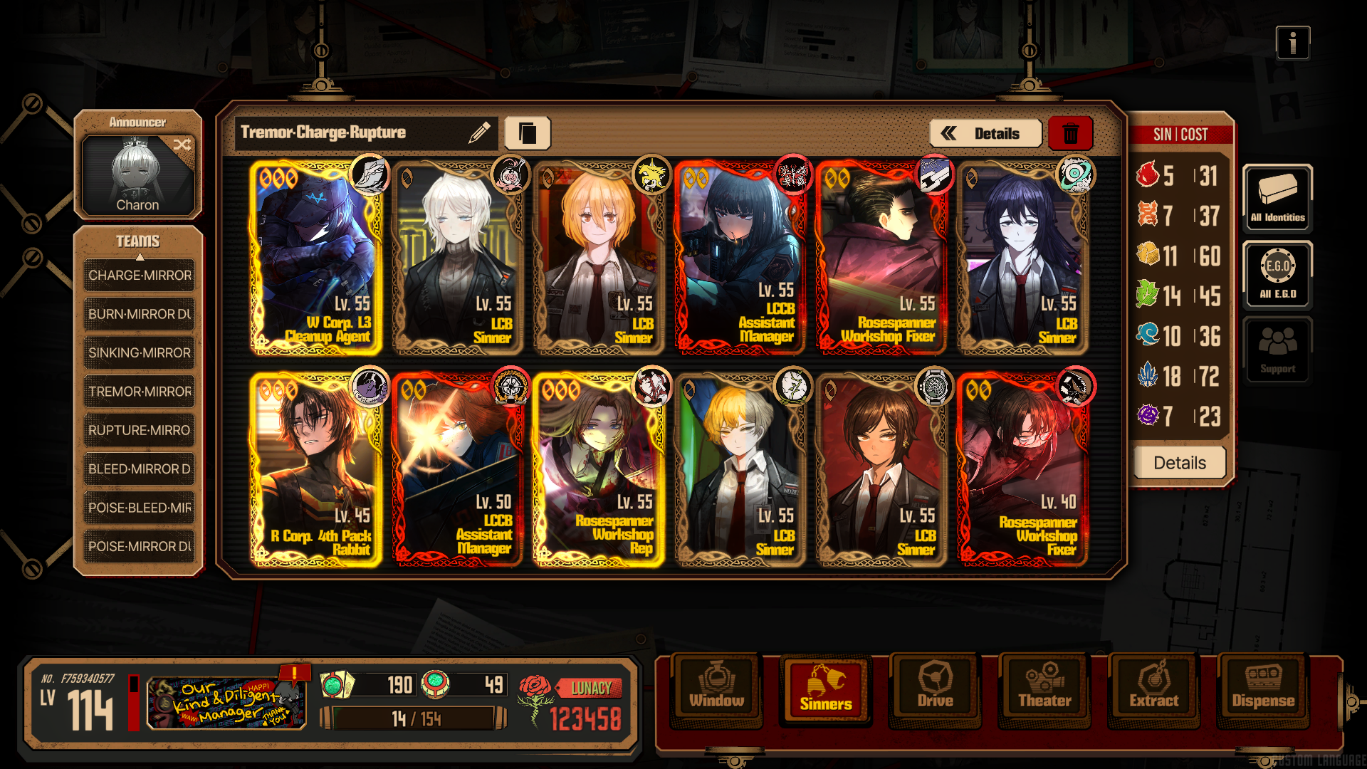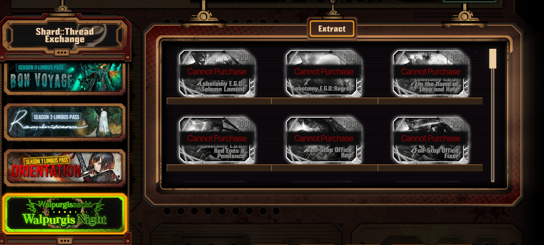 Previous thread: >>543267136Season 6 - 葬花吟 [Zàng Huā Yín]2025.05.15 —Mirror Dungeon #6 - Mirror of Immortality2025.07.03 —Refraction Railway Line 5 - Merry Go Round2025.02.20 —>Upcoming Events2025.10.23 — 2025.11.20Chapter 6.5 Murder on the WARP Express BokGak>Current Events2025.09.25 — 2025.10.23Chapter 8.5 EX - Pilgrimage of Compassion [Limbus Company x Arknights]>Upcoming Extractions2025.10.23 —[000] The Prince of La Manchaland Meursault[000] W Corp. L4 Cleanup Agent - CCA Heathcliff>Current Extractions2025.10.09 — 2025.10.23[000] Shi East Section 3 Faust2025.09.25 — 2025.10.23[WAW] Unbrilliant Glory Gregor E.G.O.[HE] To Remain Oneself[宁作吾] Hong Lu E.G.O.[HE] Command : Meltdown Faust E.G.O.Event Reward2025.09.25 — 2025.10.30[HE] Tidal Elegy Ishmael E.G.O.2025.10.09 — 2025.10.23Target Extraction: [ Gregor ] ID & E.G.O>FAQs! This game is directly tied to the setting of Project Moon's previous games, Lobotomy Corporation and Library of Ruina, and is set after both. Expect spoilers for those games in this thread.! The tutorial is important.>Download linksAppStore: https://apps.apple.com/app/limbus-company/id6444112366Google Play: https://play.google.com/store/apps/details?id=com.ProjectMoon.LimbusCompanySteam: https://store.steampowered.com/app/1973530/Limbus_Company/>Other linksOfficial twitter: https://twitter.com/limbuscompany_bOfficial youtube: https://www.youtube.com/@ProjectMoonOfficialOfficial site: https://limbuscompany.global>Required readinghttps://mega.nz/folder/xosDkZ5Z#Wt4JpUt5Bb2XG77pxuuXpw>For all your EGO and Sinner info needshttps://limbus.kusoge.xyz/https://gll-fun.com/en/>Useful resources and a general guidehttps://rentry.org/lcg_resourceshttps://rentry.org/lcbguidehttps://rentry.org/LCB_optimal_grind_guidehttps://lcb-days-since-last-id.carrd.co/https://lcb-days-since-last-ego.carrd.co/>Countdownhttps://lcbcountdown.carrd.co/