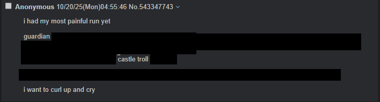 >>543404645I honestly don’t know what’s wrong with me, my days are indescribably horrible lately but the nightlords are so free. It’s good I had the animus destroyer 6000 at hand tbf
