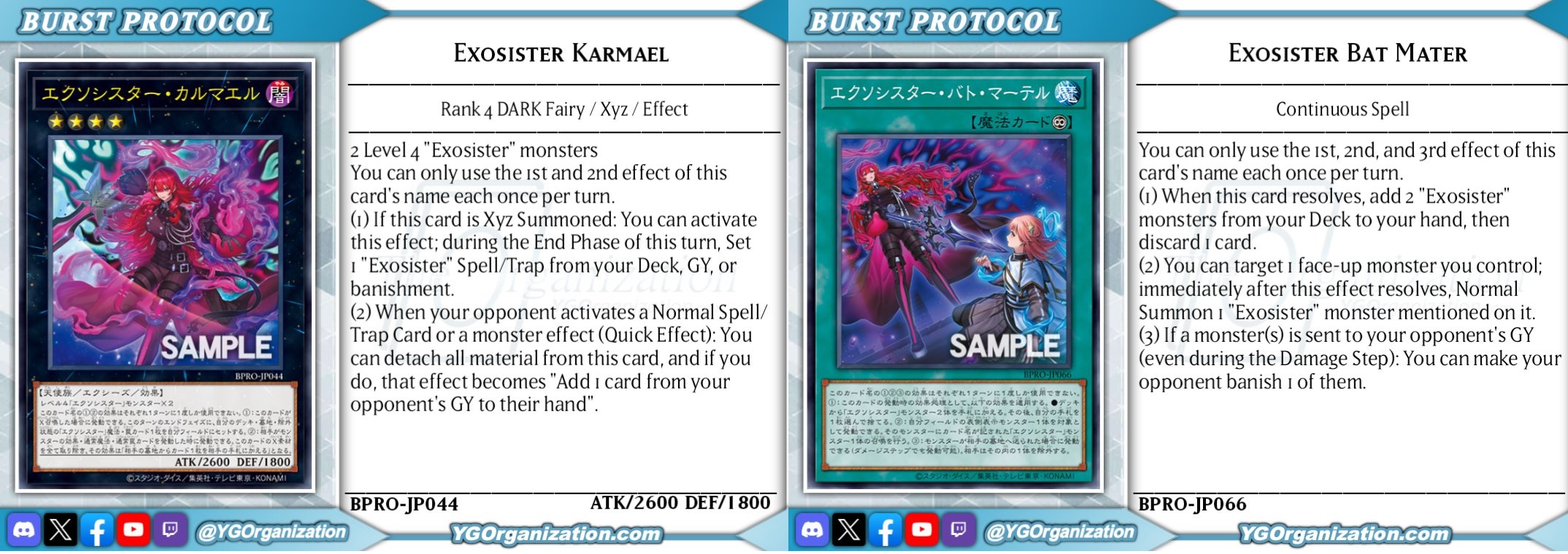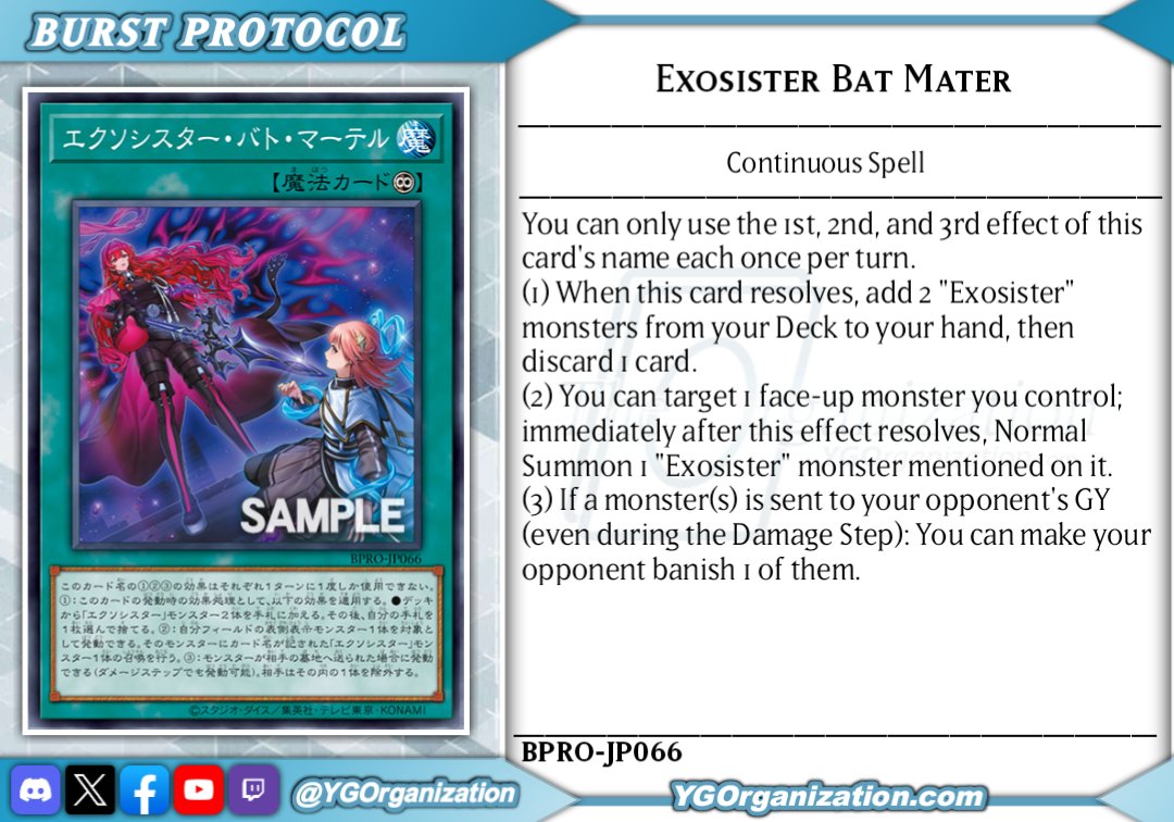 Exosister Bat MartyrContinuous Spell CardWhen this card is activated: You can add 2 "Exosister" monsters from your Deck to your hand, then discard 1 card. You can target 1 face-up monster you control; immediately after this effect resolves, Normal Summon 1 "Exosister" monster that is mentioned on that card. If a monster(s) is sent to your opponent's GY (even during the Damage Step): You can make your opponent banish 1 of those monsters. You can only use each effect of "Exosister Bat Martyr" once per turn.