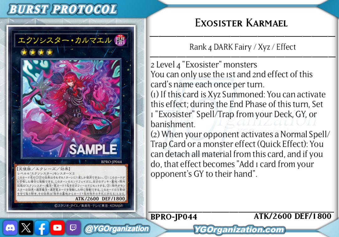 Exosister KarmaelRank 4 DARK Fairy/Xyz/Effect2600 ATK/1800 DEF2 Level 4 "Exosister" monstersIf this card is Xyz Summoned: You can activate this effect; during the End Phase of this turn, set 1 "Exosister" Spell/Trap from your Deck, GY, or banishment. When your opponent activates a Normal Spell/Trap or monster effect (Quick Effect): You can detach as many materials from this card as possible, and if you do, that card's effect becomes "Add 1 card from your opponent's GY to their hand". You can only use each effect of "Exosister Karmael" once per turn.