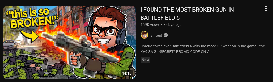 Say Something Nice About Hardline EditionBattlefield 6 Intel:>Weapon Statshttps://docs.google.com/spreadsheets/u/0/d/1oHVJQPfkTGIjdqnuDhNrD16GETNQCWa0aofBQOtjg9w/htmlviewBattlefield News:>Battlefield 6 sells 6.5 Million and countinghttps://alineaanalytics.substack.com/p/battlefield-6-is-a-smash-hit-launch>DICE acknowledges hit registration issueshttps://www.pcgamer.com/games/fps/its-not-just-you-hit-registration-is-bugged-in-battlefield-6-and-dice-is-working-on-it/>Cronus Zen Software Users bannedhttps://www.gamesradar.com/games/battlefield/battlefield-6-fans-cheer-as-popular-cheat-maker-tells-users-to-pause-for-now-following-a-swift-banning-spree-from-ea-they-deserve-zero-second-chances/>Playing with /bfg/? Check the Squad List and add yourselfhttps://pastebin.com/hpEGpj7HPrevious: >>543375831