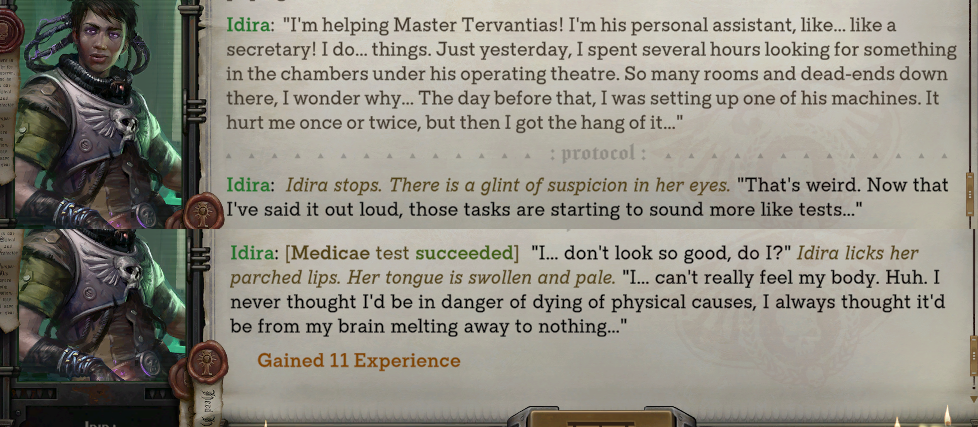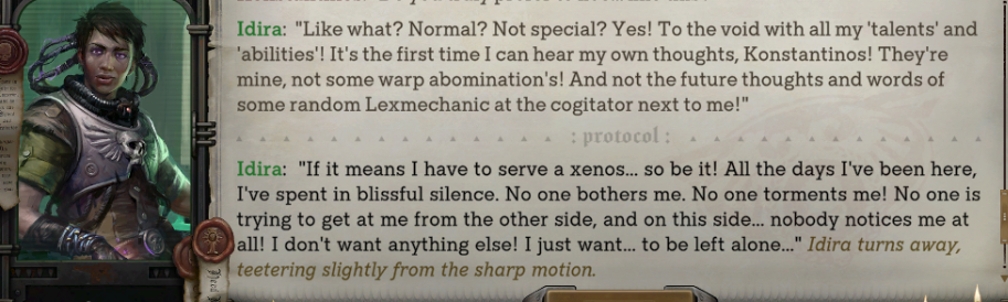 >>543440767>you don't understand where owlcat was going with argentas characterNeither did they lmao>>543440746>I can't feel Him anymore! His light cannot reach me in this place. What am I to do Rogue Trader?[Kiss her][Hug Argenta][Tell her to stop whining][Tell her that the Emperor's light dwells eternally in the heart of every human]
